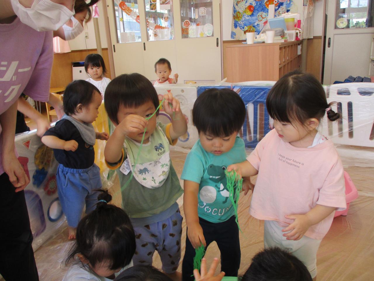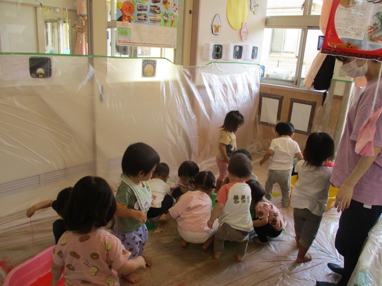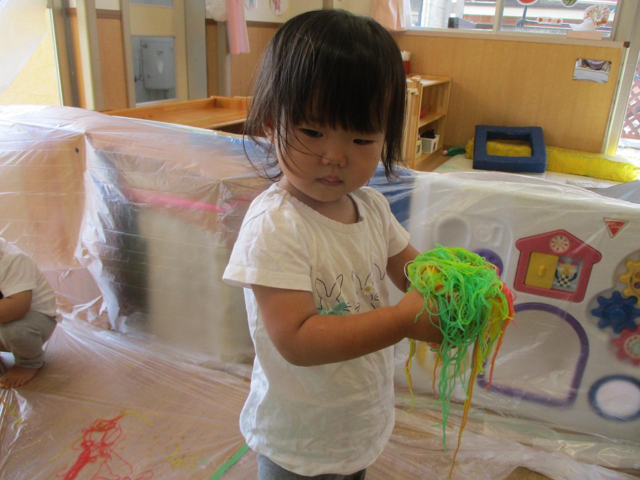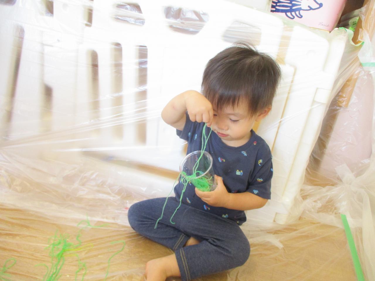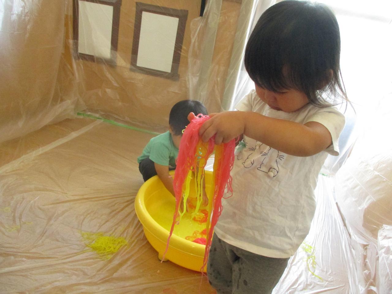 直接触れてたのしんだり、カップに入れてパフェのようにしてみたり、保育者にあーんとしてみたり、色の混ざる様子を観察していたりと子どもたちがそれぞれ自分の思うままに楽しむ姿がありました!