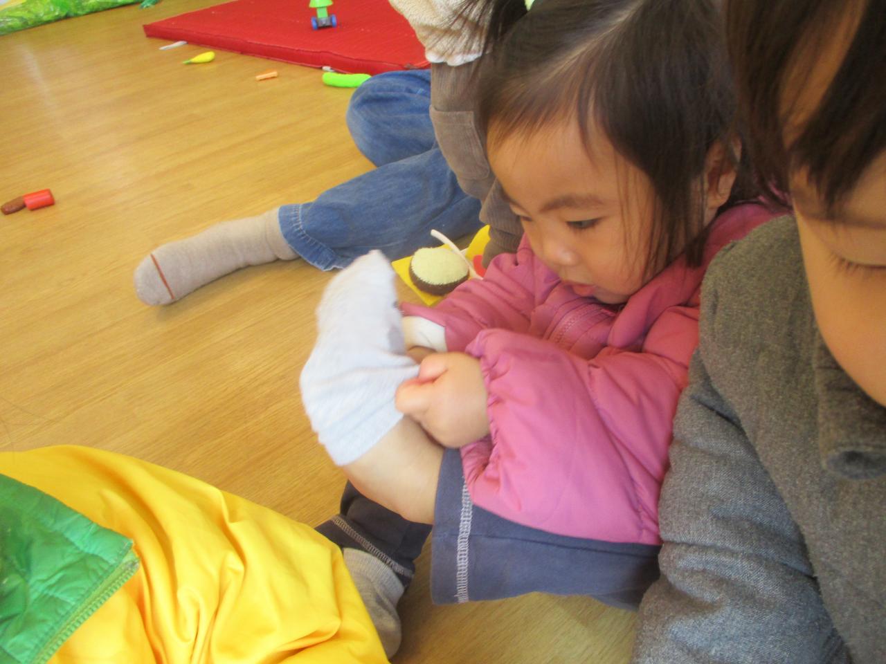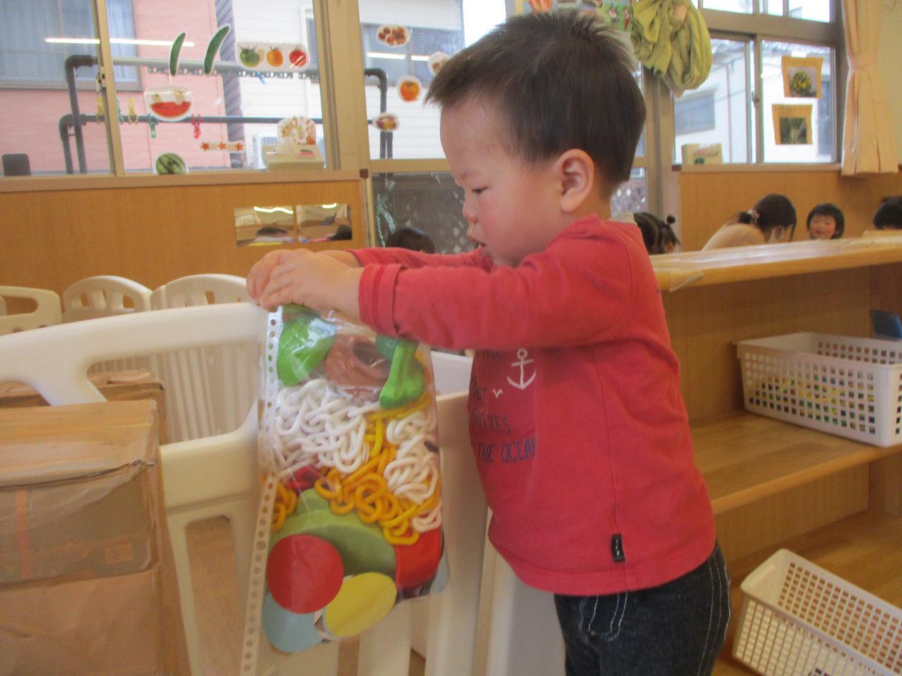 「やってみよう」と大人がすぐに手伝うのではなく、まずは自分でやってみようと思えるように、自分でできる所を作りさりげなく手伝っています。