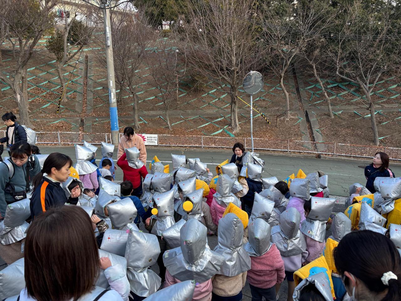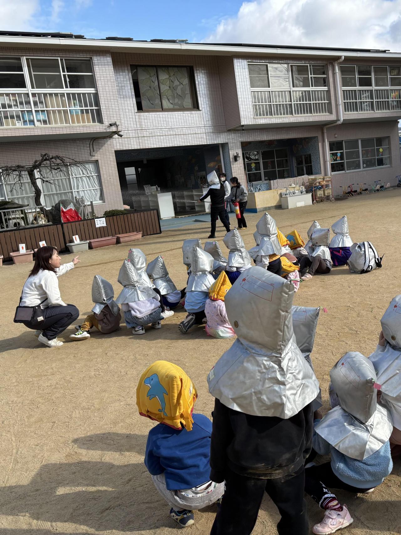 避難訓練では、ホールに広がっている落下物を想定した大型ブロックや机などに気をつけながら園庭に避難し、出火を想定した消火訓練や第2避難場所の松尾小学校にも行きました。