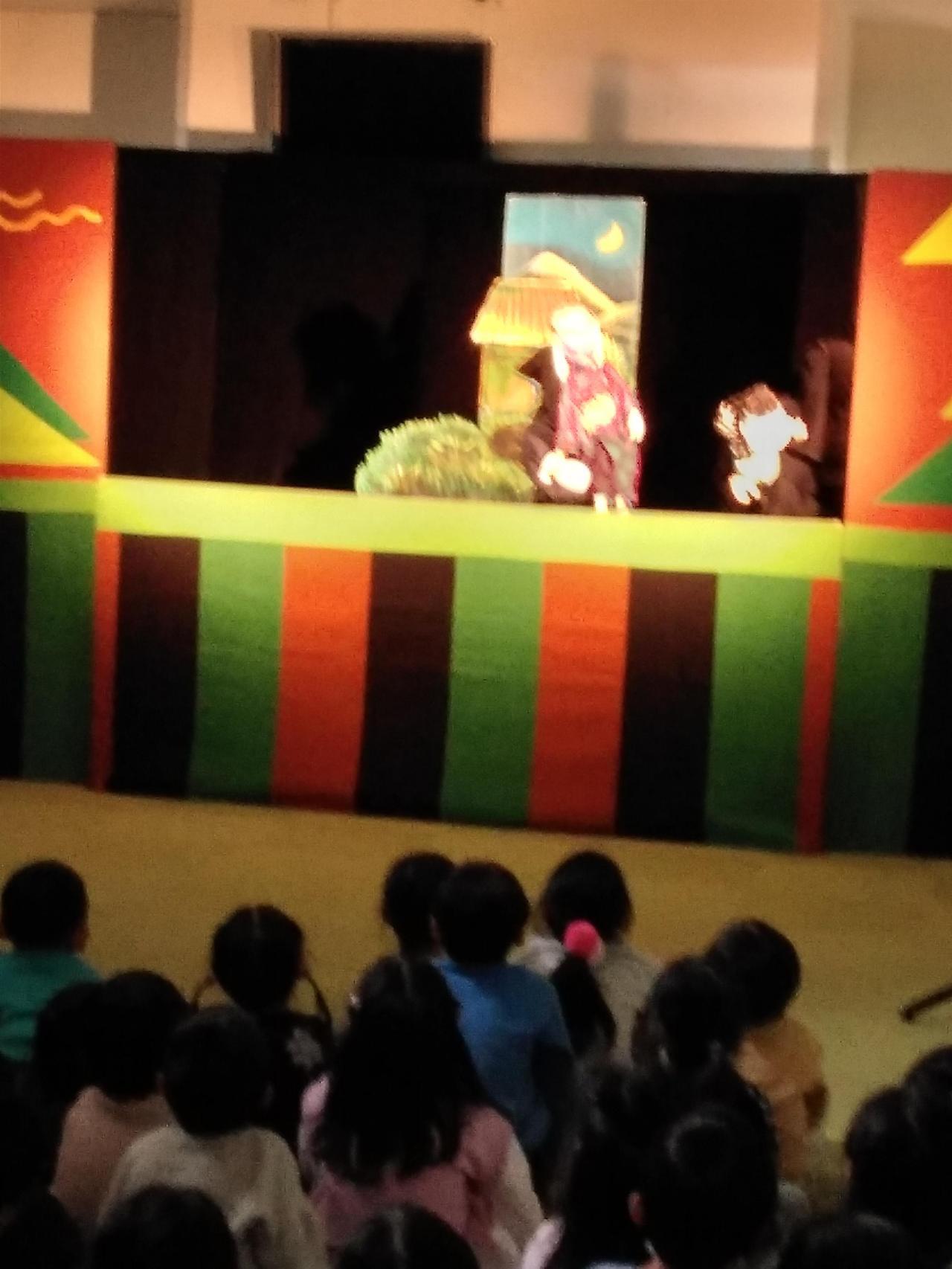 「うわばみ(ヘビ)」が登場すると、「こわ!」「ながーい!」とびっくりする様子もみられましたが、最後まで興味をもって見ることができ、劇団の方にもしっかりとお礼を言うことができました。