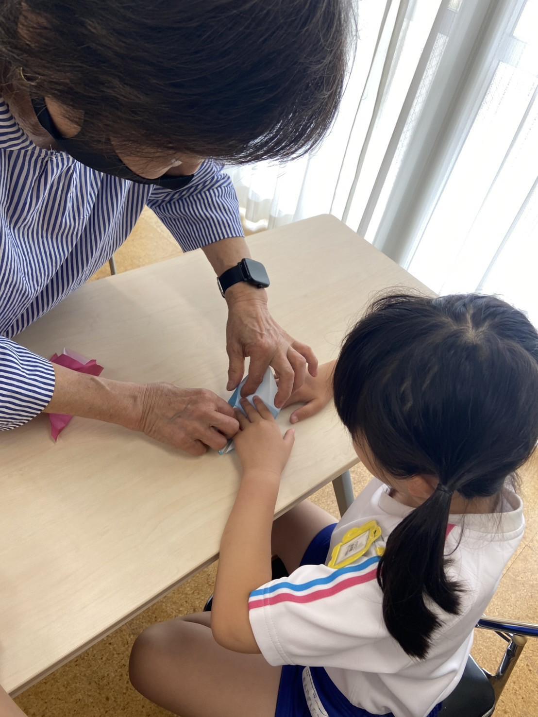 鶴の折り方を教えてもらいました。「ここはどうするの〜?」「そうやってするのか!」とおじいちゃんおばあちゃんと会話を楽しみながら教えてもらい完成すると「できた!」と嬉しそうでした。