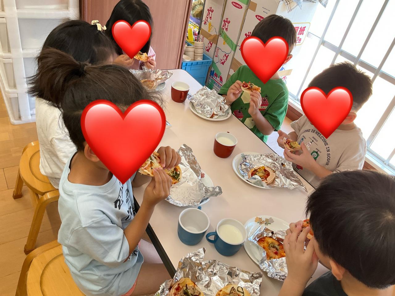 おやつの時間に作ったピザを食べました。「パリパリしてるね!」「本物のピザみたい!」とおいしく食べることができました。