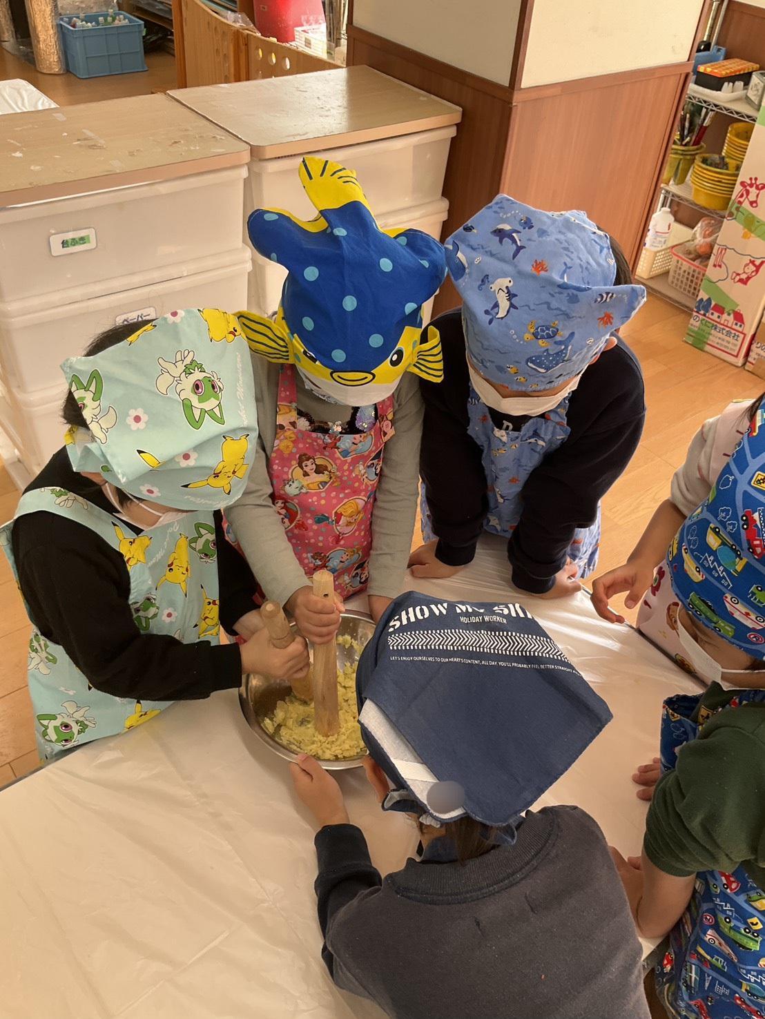 さつまいもをつぶす時にボウルが動いてしまい上手くできない友達を見て「僕が押さえてあげる!」と協力する姿が見られました。