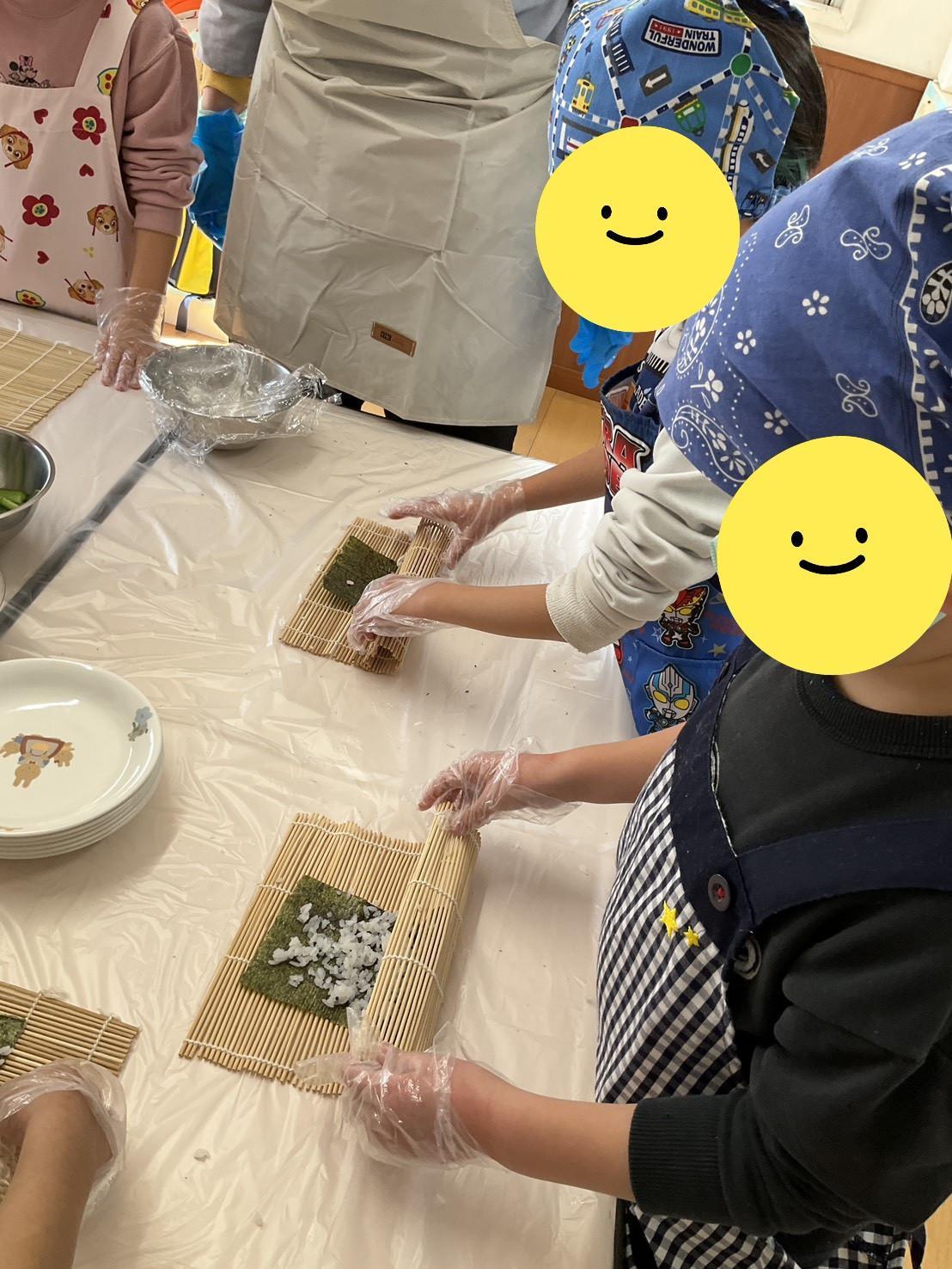 5歳児は節分の行事を終えてからクッキング保育で巻き寿司を作りました。海苔の上に酢飯を広げて具材を乗せ、巻きすを巻き込まないように「ぎゅっぎゅっ!」と慎重に巻いていました。今年は南南東の方向を向いて心の中で願い事をしながらみんなで食べました。