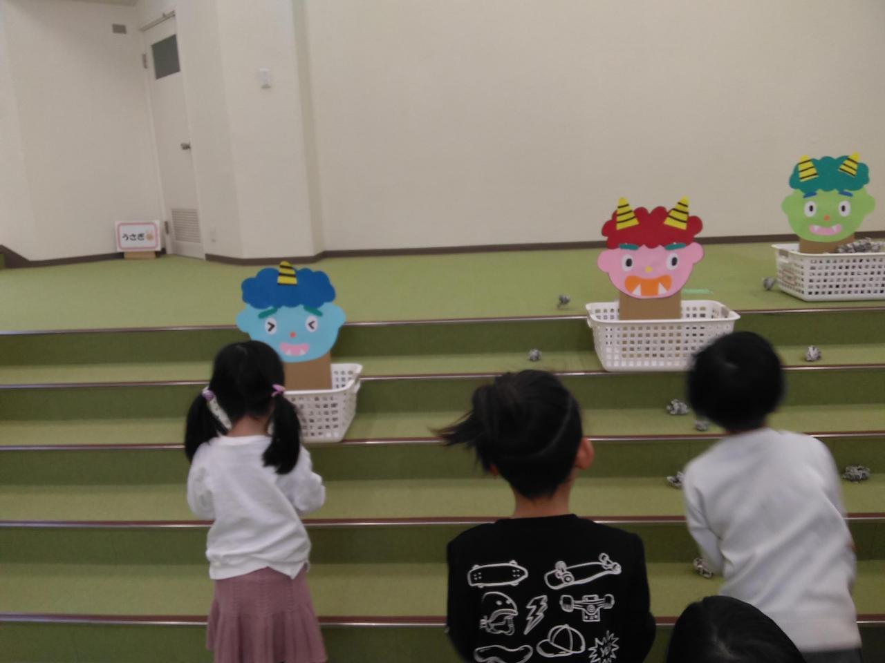 ♪鬼のパンツ の曲に合わせて踊った後は待ちに待った豆まき。各クラス・グループで事前に新聞紙を丸めて作っておいた豆を、色々な色の鬼に「鬼は外!」「福は内!」と豆まきをしたり、友達がしている姿を見て「がんばれー!」と応援したりしました。