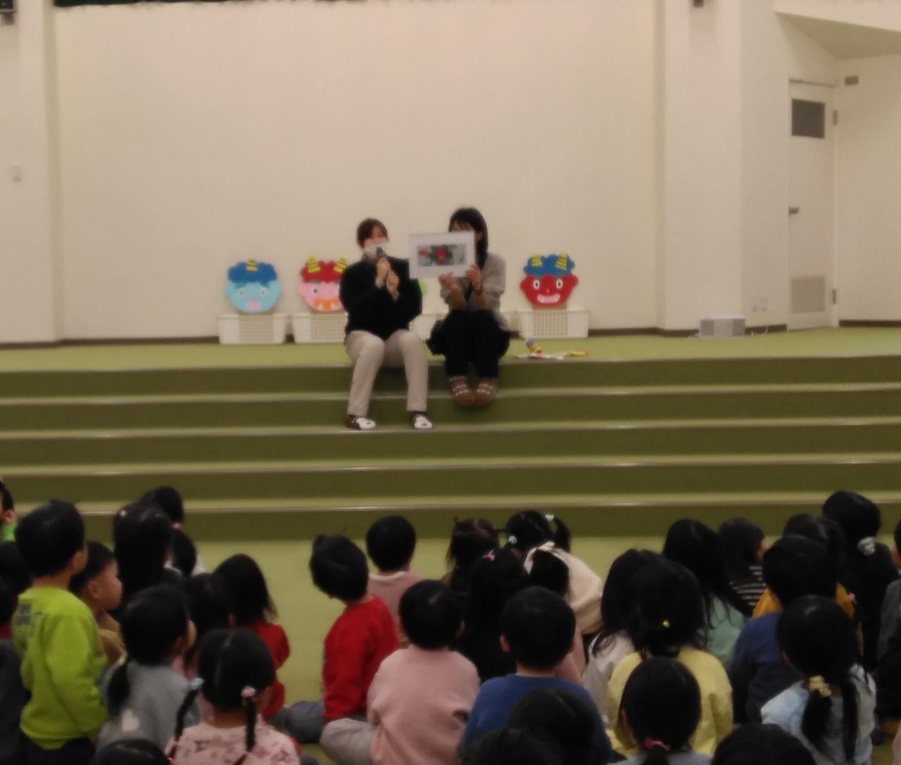 ホールに集まって節分の行事に参加しました。