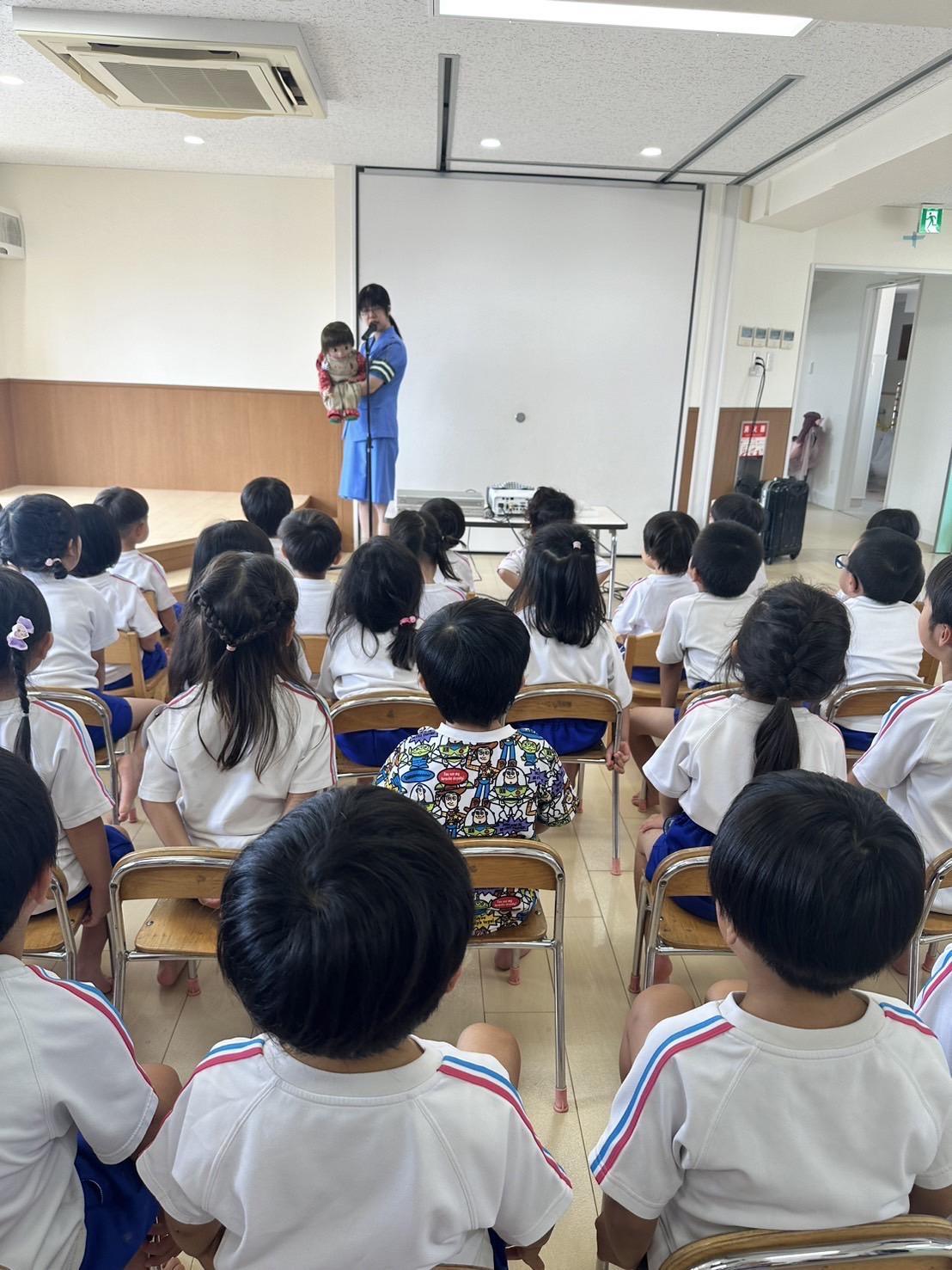 交通ルールを知らない、腹話術のけんちゃんに、「信号が青になったら、右左右って見るんだよ」「命は1つしかないから気をつけて!」と教えてあげることで、子どもたちは交通ルールを再確認することができました。