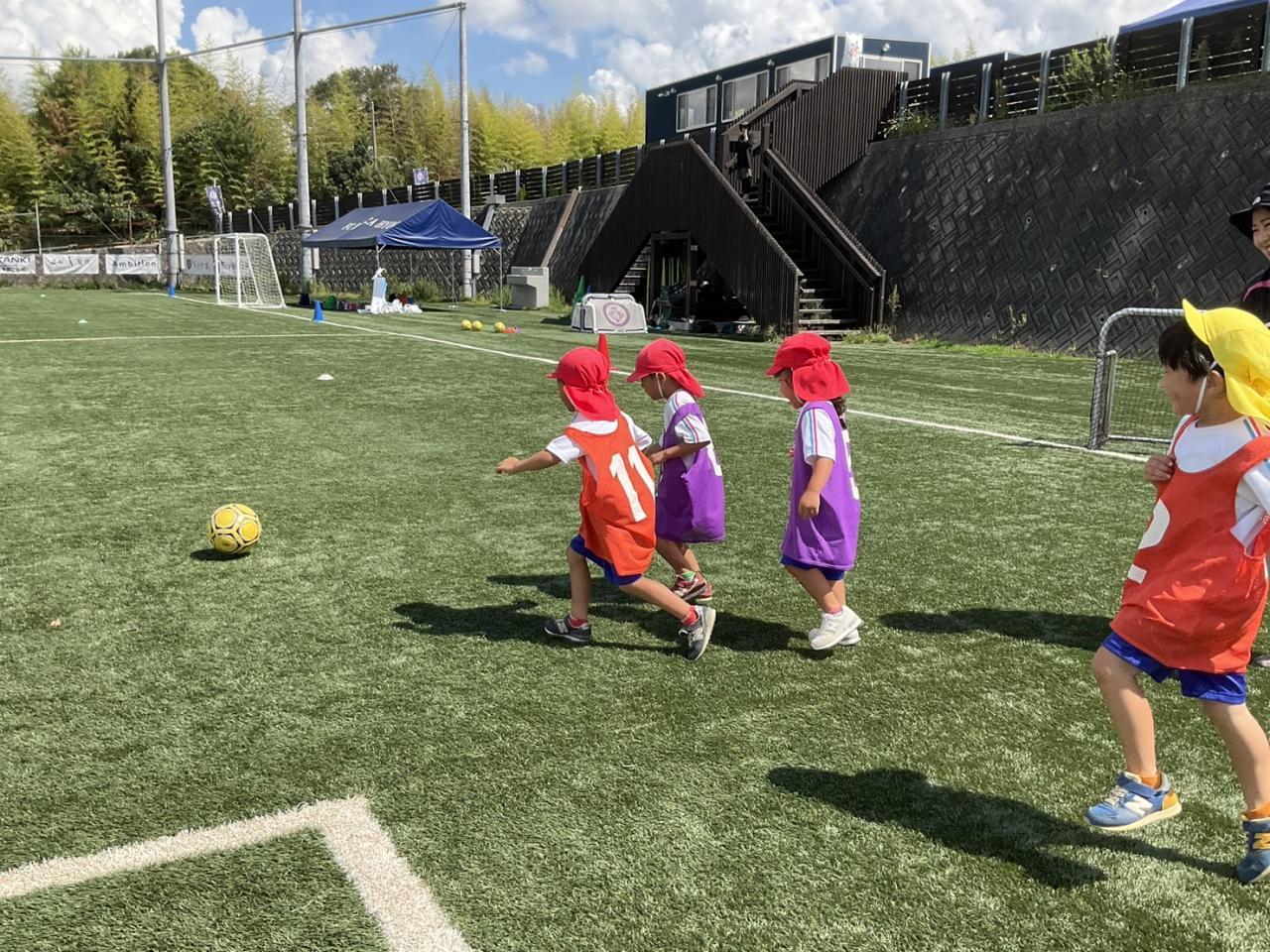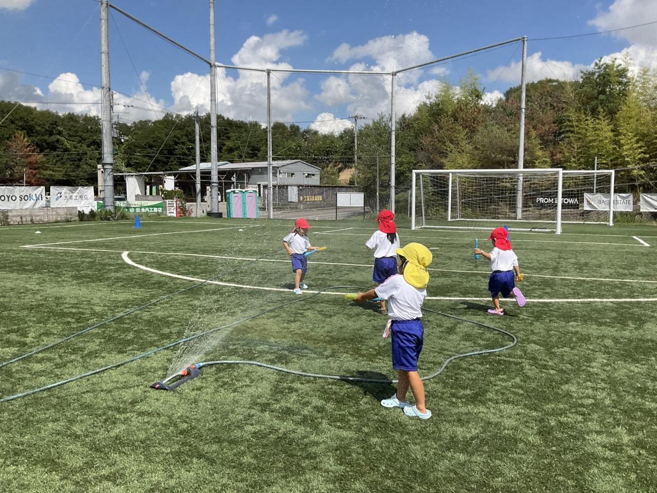 グラウンドに着くと「やった〜!ふかふかの芝生!」広いグラウンドでたくさん走ってサッカーをしたり、コーチと水遊びを思いきり楽しみました。たくさん遊んだ後はお弁当!
