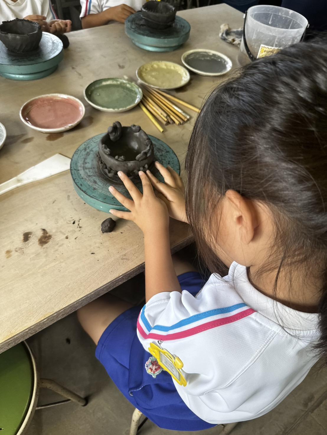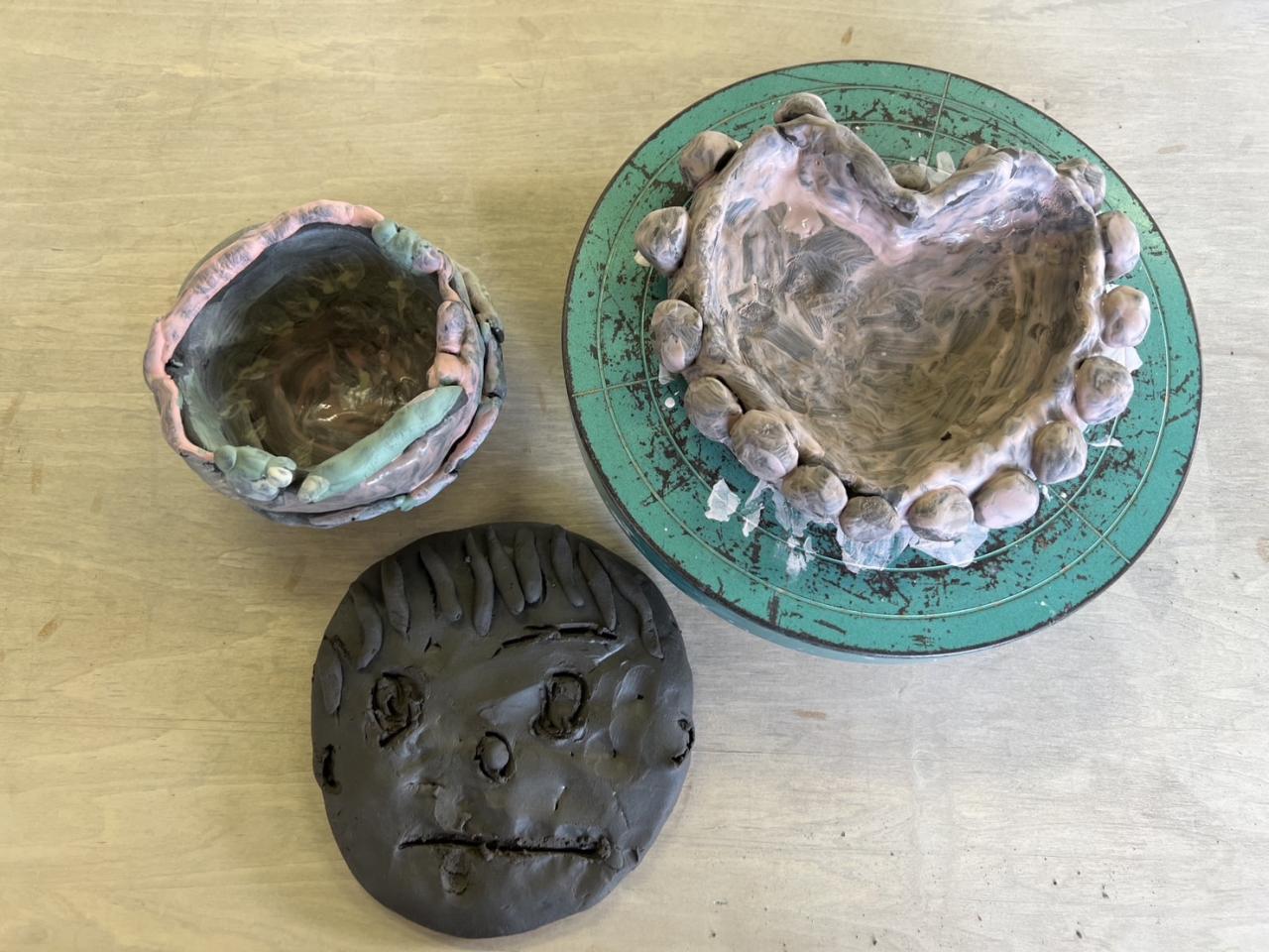 陶芸教室では、3歳は「かお」、4歳は「お皿」、5歳は「小物入れ」を作りました。「なんだか冷たいね」「硬いけどこんな形できた!」と粘土の感触を楽しんだり、完成したものを見せあったりして3月の焼き上がりを楽しみにしている子どもたちです。