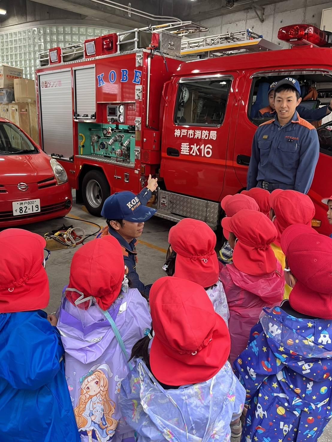 4歳児が消防署舞子出張所を見学しました。「消防車と救急車いるかな?」とワクワクしながら歩きました。
