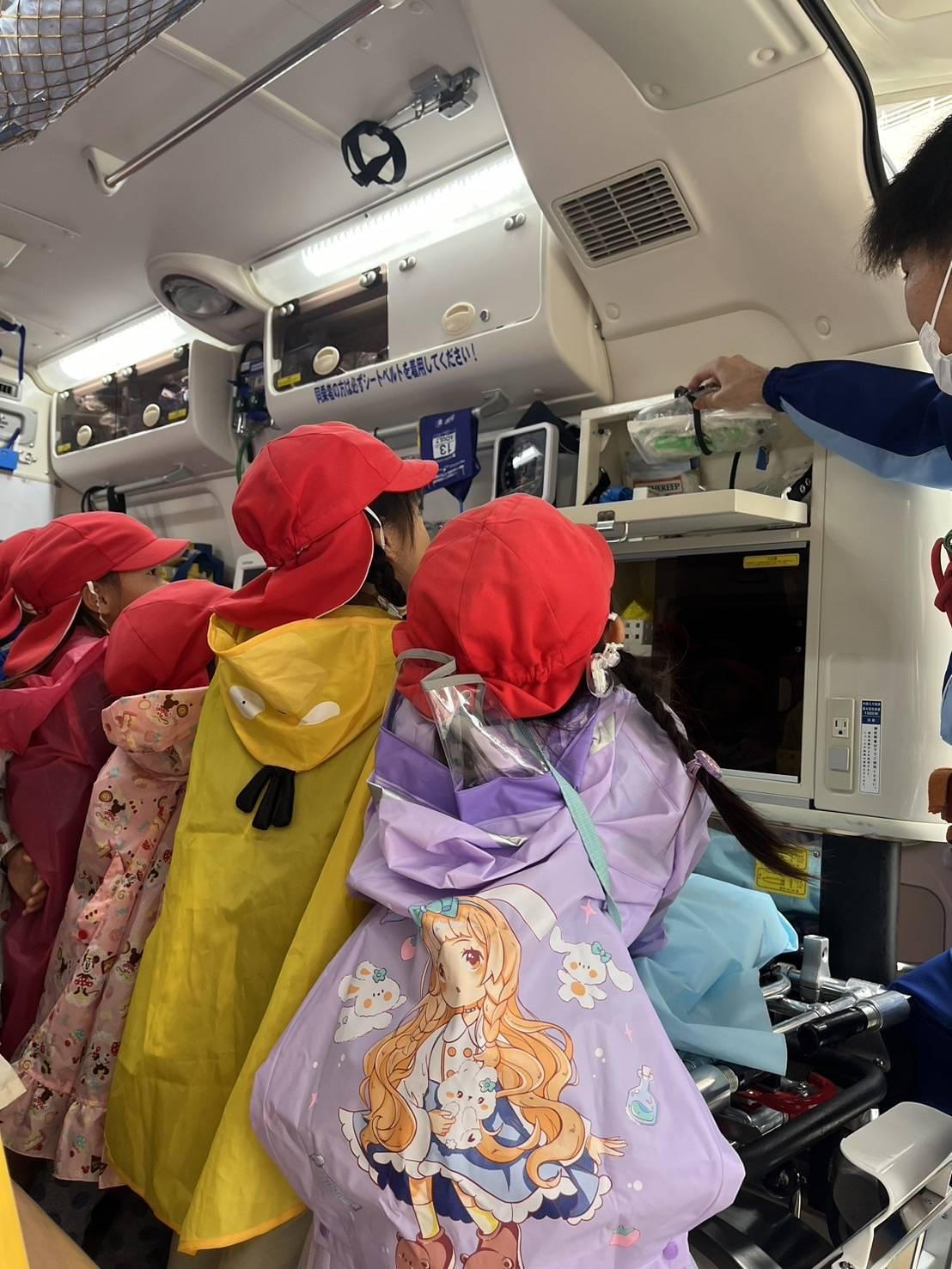 消防車、救急車に乗せてもらいサイレンの鳴らし方や、救急車の中には担架だけでなく、酸素ボンベや救命処置セット、病気や怪我をした人を助けるために色々な機械を積んでいることを教えてもらいました。