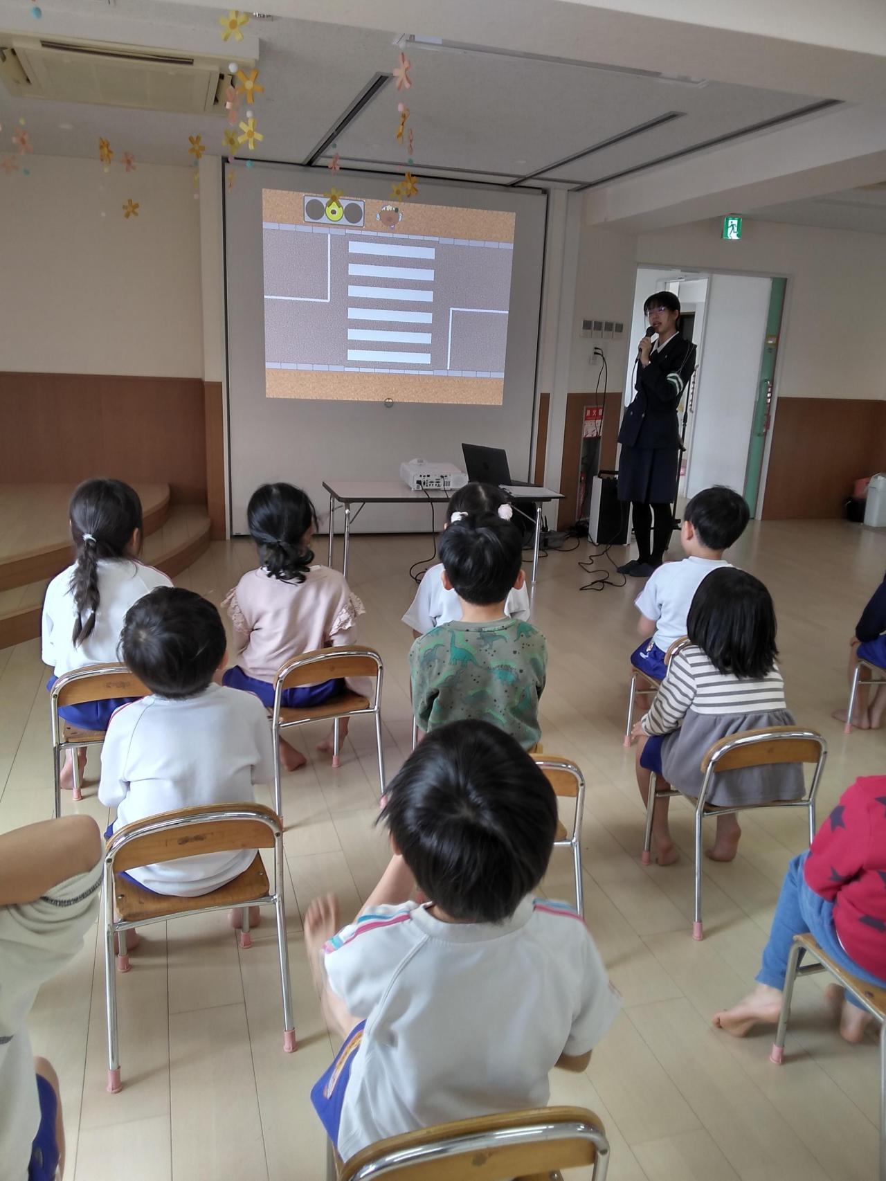 5歳児が垂水警察の方から小学校に向けての交通安全指導を受けました。警察の方のお話を聞き、約束をみんなで学びました。