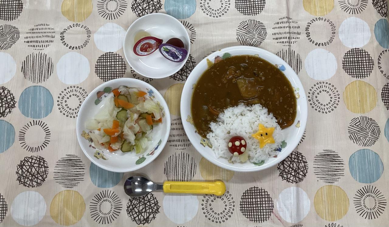 たくさん体力を使ったのでお腹がぺこぺこ。すると、何やら遠くから楽しい音楽が!マリオの曲が流れて、調理の先生特製、⭐︎マリオカレーの登場です⭐︎「マリオのきのこがある!」「スターだ!」スターがついたマリオカレーを食べてパワーアップした子どもたち!