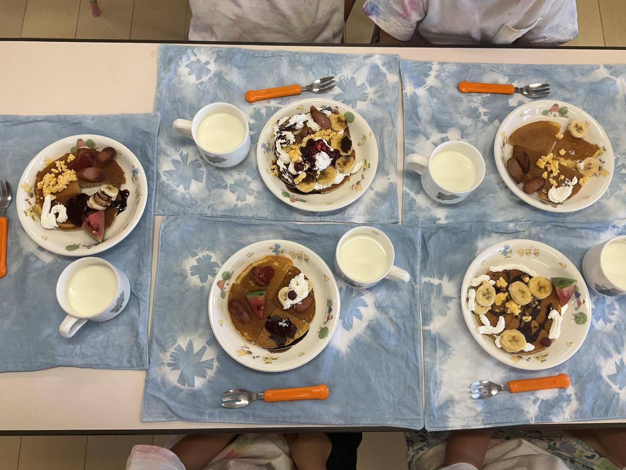 保育園に帰り、タデアイで藍染めしたランチョンマットを敷き朝食!パンケーキSpecialです!