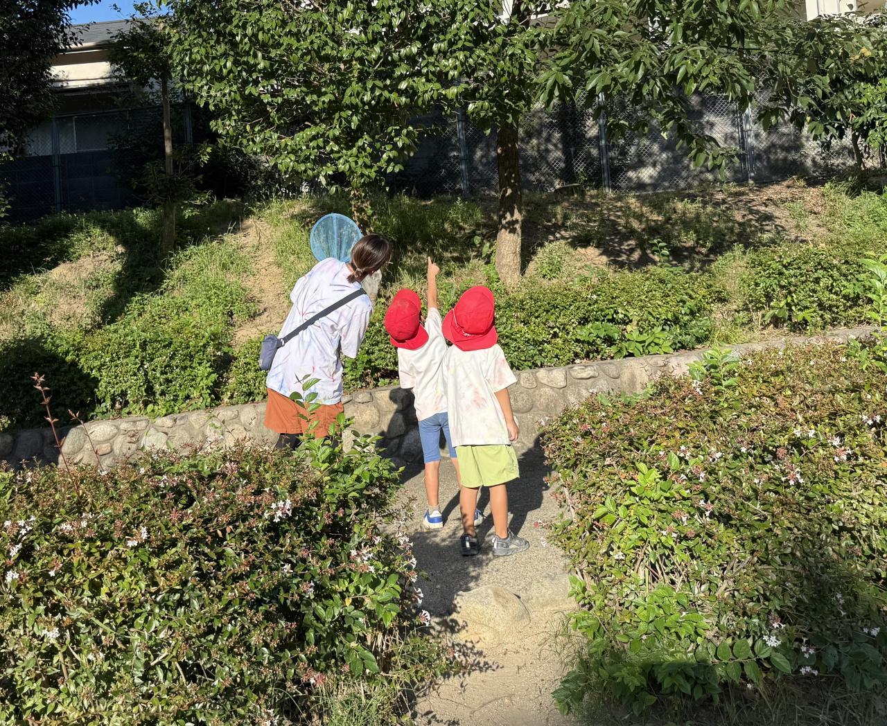 地域の方と一緒にラジオ体操をしてしっかり体を動かし、セミ取りへ。「あそこにアブラゼミいたよ!」「いたー!つかまえたー!!」とみんなで14匹捕まえて大満足。