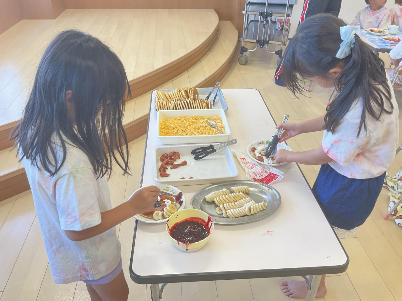 パンケーキの上にウインナーやスクランブルエッグ、バナナなどトッピングしていただきます!「美味しいー!」「自分でトッピングするの楽しいね!」「ブラックベリーとチョコが合う!」など話し楽しく食べました!