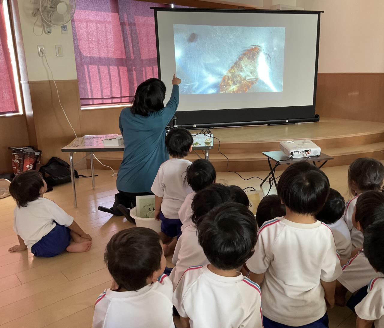 また、ダンゴムシやヤスデ、バッタやてんとう虫なども観察しました。「ダンゴムシの足は何本?」と聞かれて「14本!」と大きな声で答える子もいました。足が動いている様子を近くで見ることができ興味津々の子どもたちでした。