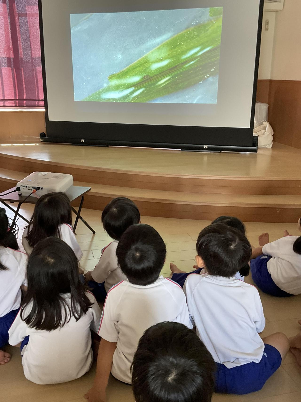 マイクロスコープで見てみると、「うわー、毛がいっぱい生えてるね」「遠くで見たら丸い形だけど近くで見るとしま模様だね!」と見え方が違うことにも気づくことができました。