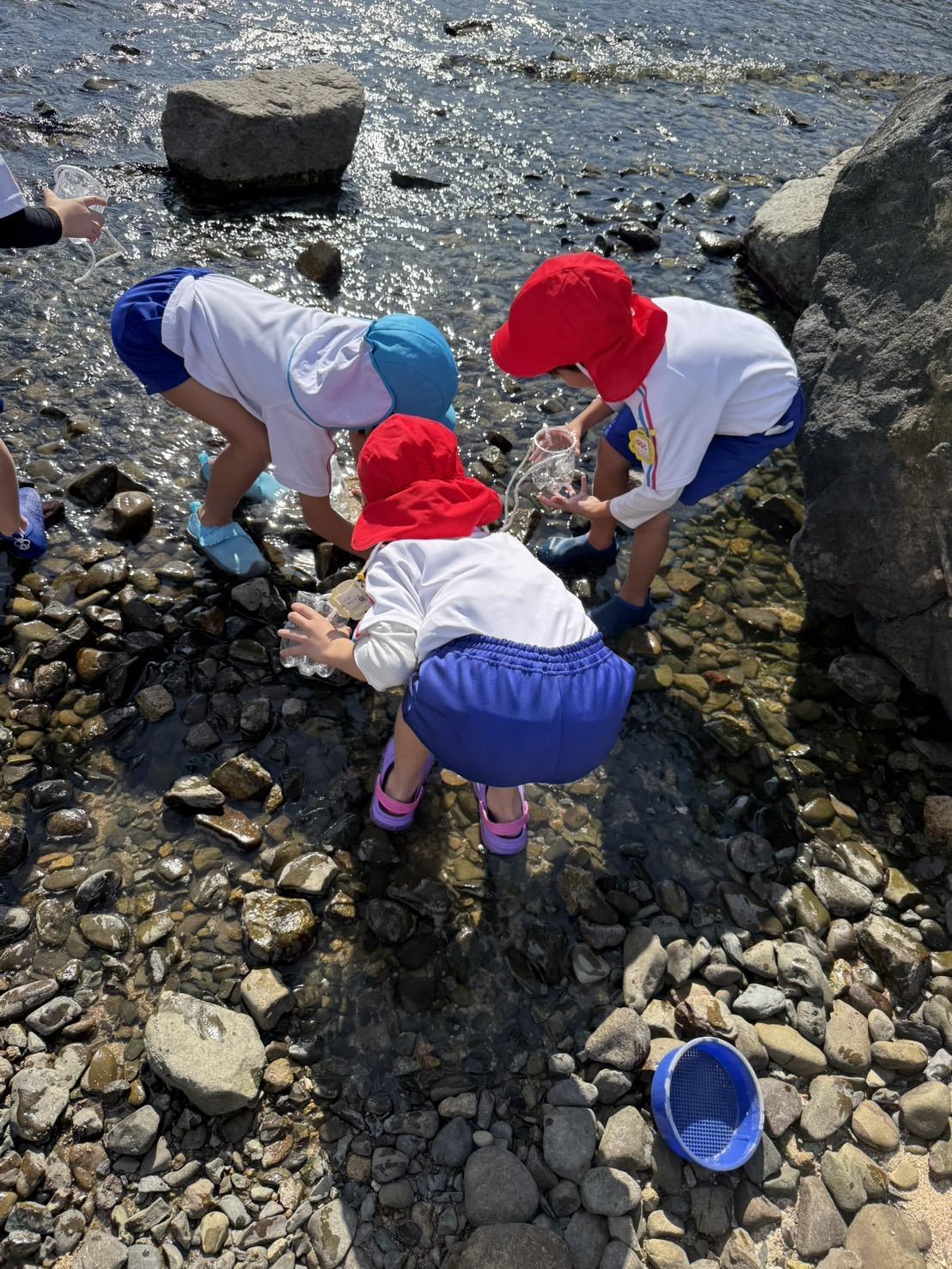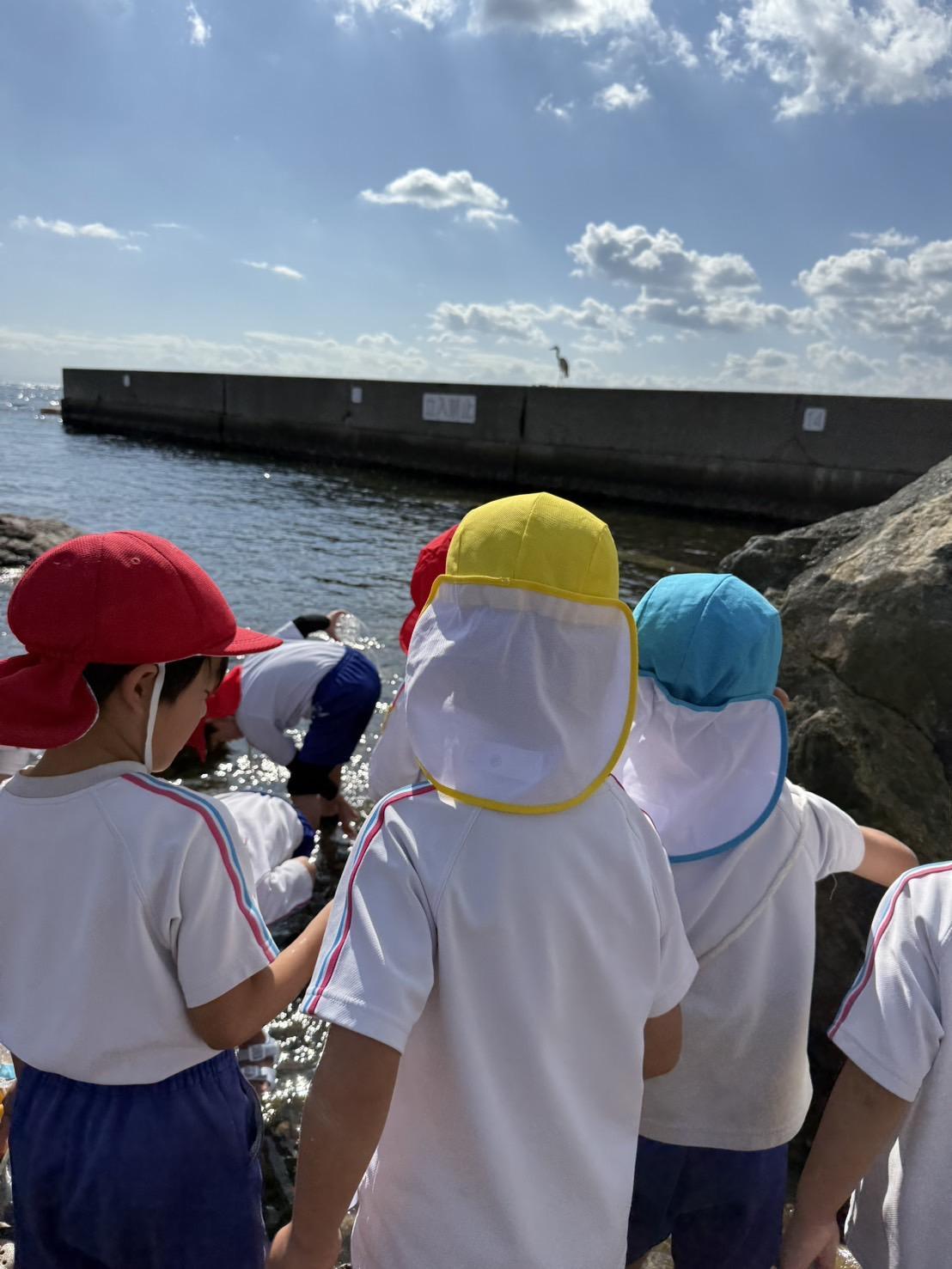 さくら組が、やまびこ保育園の5歳児とアジュール舞子で交流をしました。 グループで自己紹介をして、「何を見つけたいかな?」「海には、何がいるかな?」と話をしてわくわく。海に足をつけてみると「水冷た〜い。気持ちいいね。」と話をしたりやまびこ保育園の子ども達に、「石の下にカニがいるんだよ」と捕まえ方など教えてあげたりして、一緒に探しました。マイクロスコープでカニを見てみると、カニの甲羅の模様や足の形など、観察しました。カニは、全部で80匹、ヤドカリは223匹見つけました。「アオサギだ」と飛んできた鳥の名前を知っている子もいて、みんなで空を見上げました。たくさん遊んだ後は舞子公園に行き、お弁当を食べ、遊具や鬼ごっこ、秋見つけをして遊びました。 楽しい時間はあっという間に過ぎ、お別れの時間。「海でカニ探し一緒にできて楽しかった!」「ヤドカリもいっぱいいたね。」「お弁当一緒に食べて美味しかった」と感想を伝え合い「またね〜!」と手を振り別れました。帰り道「いっぱい遊んで楽しかった!」 「友達出来たよ!」と楽しい時間を過ごしました。