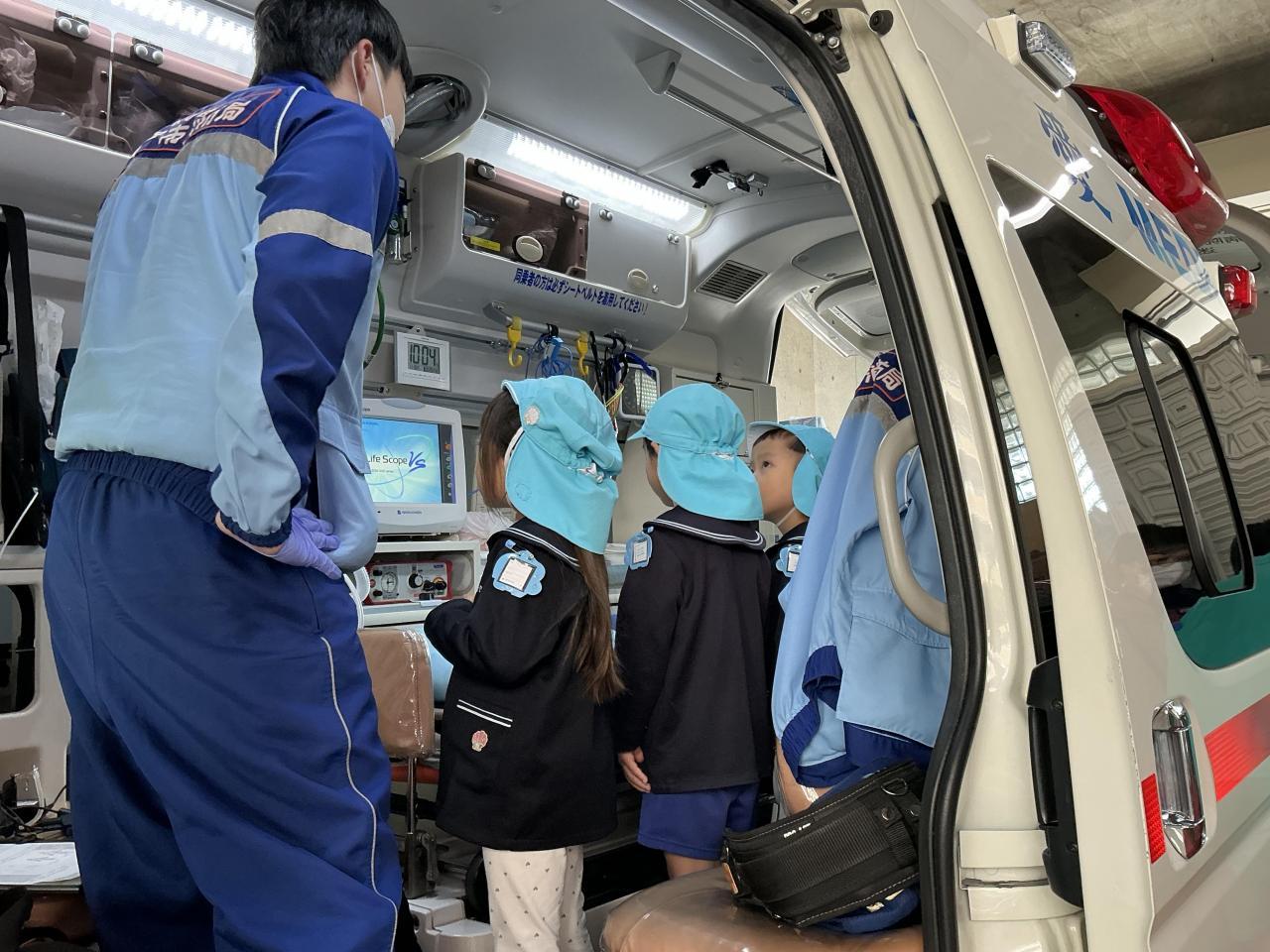 消防署では、救急車と消防車の中に乗せてもらい、「寝るところと機械があるよ」「ヘルメットもあるね」と興味津々の子ども達。