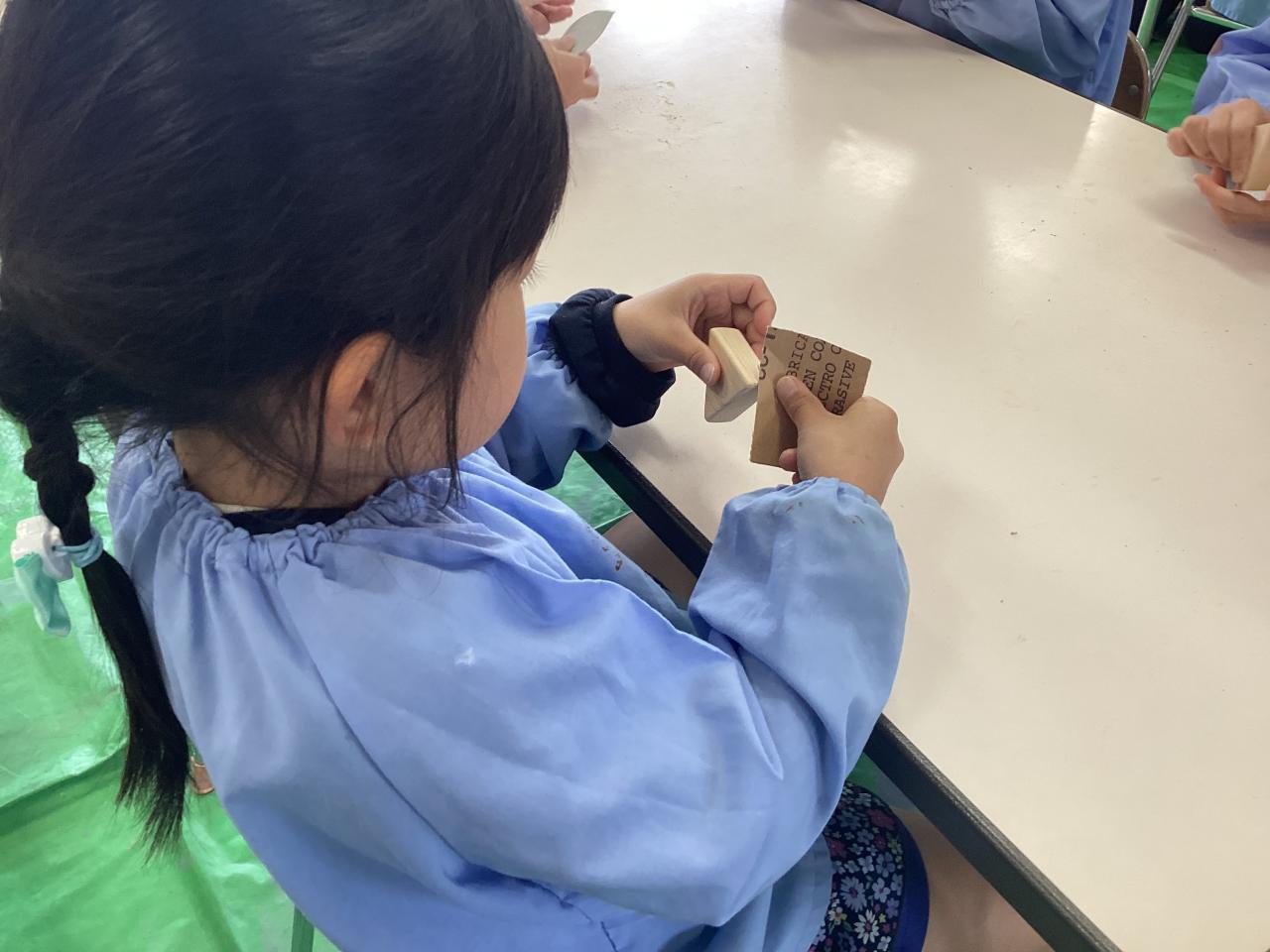 削る前に、「これはヒノキっていう木で作ってるから、削るといい匂いがしてくるよ」と言われ、削っていくと、ふわっと木の香りがして、「あ!いいにおいがする!」「積み木のおもちゃのにおいがする!」「手もいいにおいになってるー」と、ヒノキの香りを楽しんでいました。