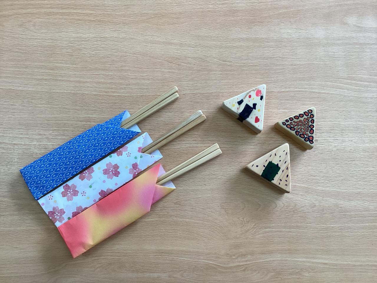 おにぎりは三角、お箸は子ども用の小さいお箸をやすりで削って作りました。
