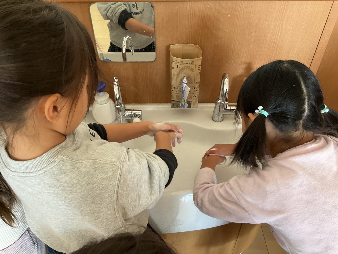 3〜5歳児が薬剤師さんによる手洗い指導を受けました。手には見えない菌がたくさんついていて、悪い菌を洗い流すことがとても大切だと言うことや、指の間や手の甲は洗い残しが多いことを教えてもらいました。