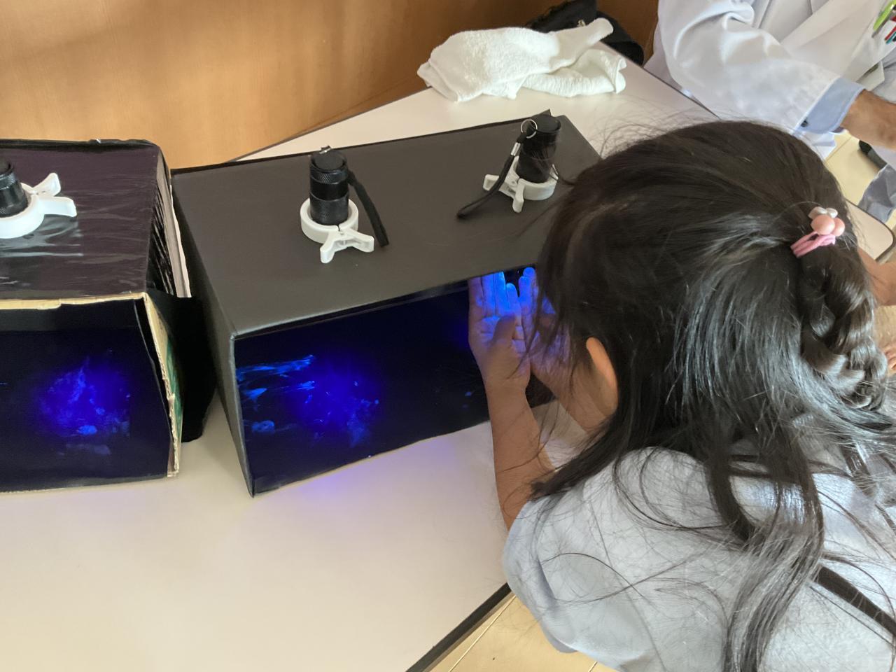 「綺麗になったかな?」とブラックライトを当てると、洗い残し部分が白く光り「まだついてた」「あと指と手の甲を洗ったら全部取れそう!」と、白い光が見えなくなるまで繰り返し手を洗いました。