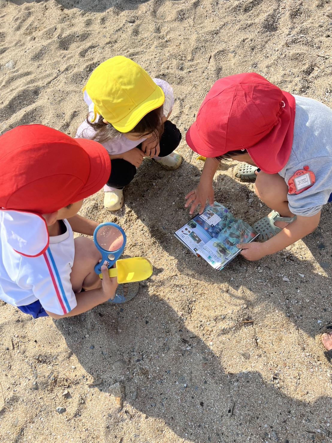 生き物探しをしていると、岩の間に黒い貝のようなものを発見!マイクロスコープで観察をしたり、「図鑑に載ってるかな?」「これに似てる!」と、友達と一緒に話をしながら図鑑で調べ、色、大きさを比べたりしました。「保育園にある図鑑でもよく調べてみよう!」と楽しみにしています。
