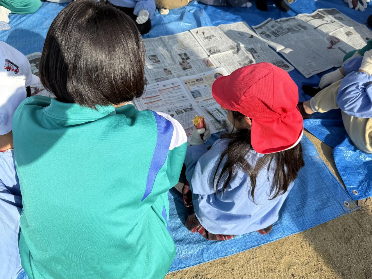 中学校交流の日でもあり、中学生のお兄さんお姉さんも一緒に焼きました。前日に、さつまいもを濡らしたキッチンペーパーとアルミホイルで巻いて準備をし「早くやきいもしたいな」とワクワクしていた子ども達。