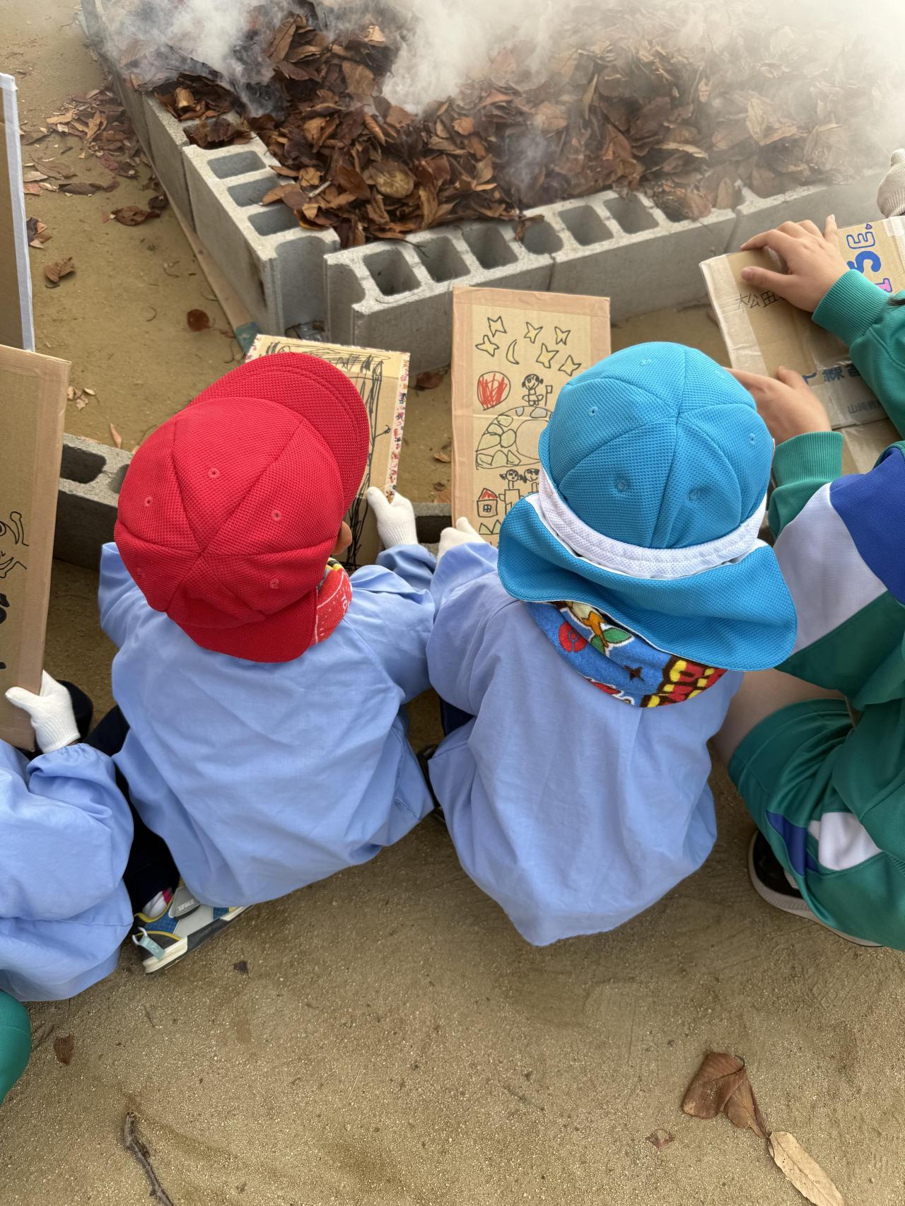 当日は、5歳児がブロックで作ったコンロに、みんなで拾った落ち葉とさつまいもを入れて着火しました。火がつくと「白い煙が出てるよ!」「パチパチ音がする!」と気づく子がいました。段ボールのうちわで、中学生や地域の方、ボランティアの方と一緒にあおぎました。「最初に火をつけた時より煙が大きくなっている!」「葉っぱの焼ける匂いがするよ」「火が大きくなったね」と煙や葉っぱの変化に気付きながら、焼けるのを楽しみにしていました。
