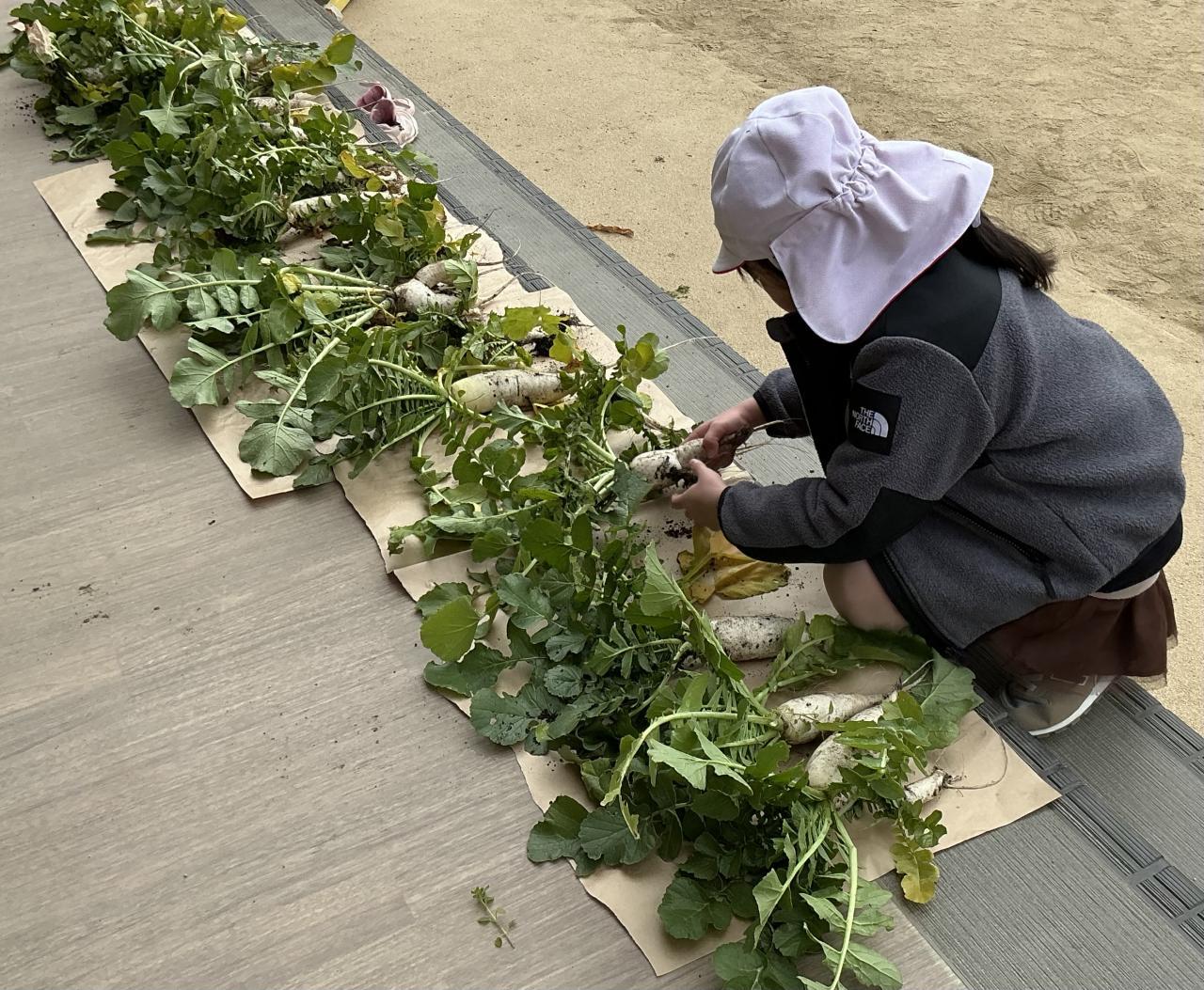 お兄ちゃん、お姉ちゃん達の真似をしながら収穫し「やった!大根だ!」と喜び、並べたものをじっくり観察していました。