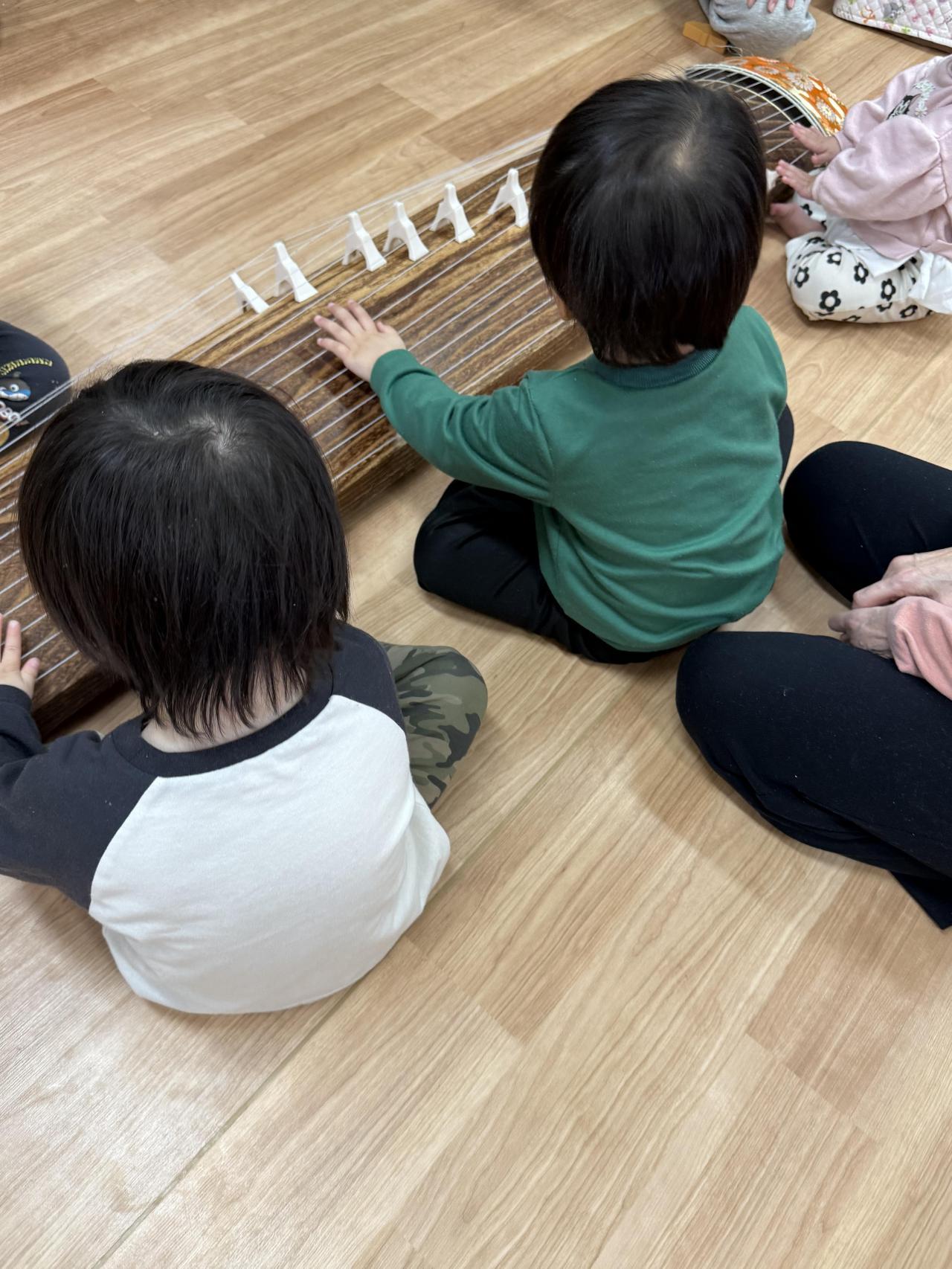 さくら組は琴の体験をしました。琴を近くで見て、弦の太さや本数、琴の音の鳴らし方を知り、「きらきら星」や「ちゅうりっぷ」を弾いて楽しみました。
