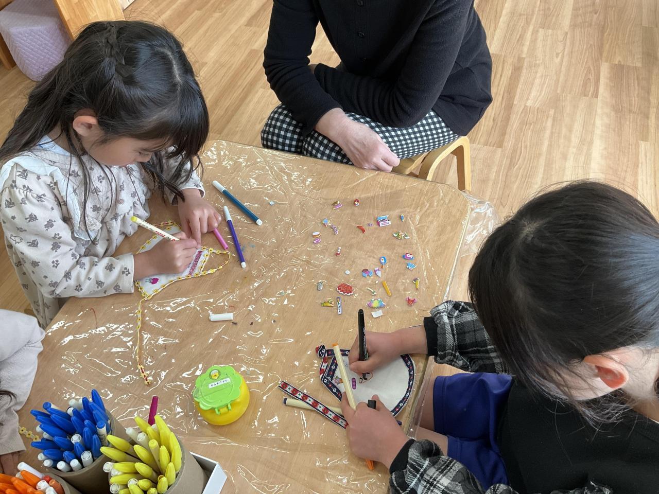 折り紙では、パックンチョ、小物入れ、おひなさまを作ったり、布のエプロンにペンで絵を描いたりシールを貼ったりしました。「細かく書いていて綺麗だね」「女の子の髪の毛、くるくるしていてかわいいね」とたくさん褒めてもらいました。