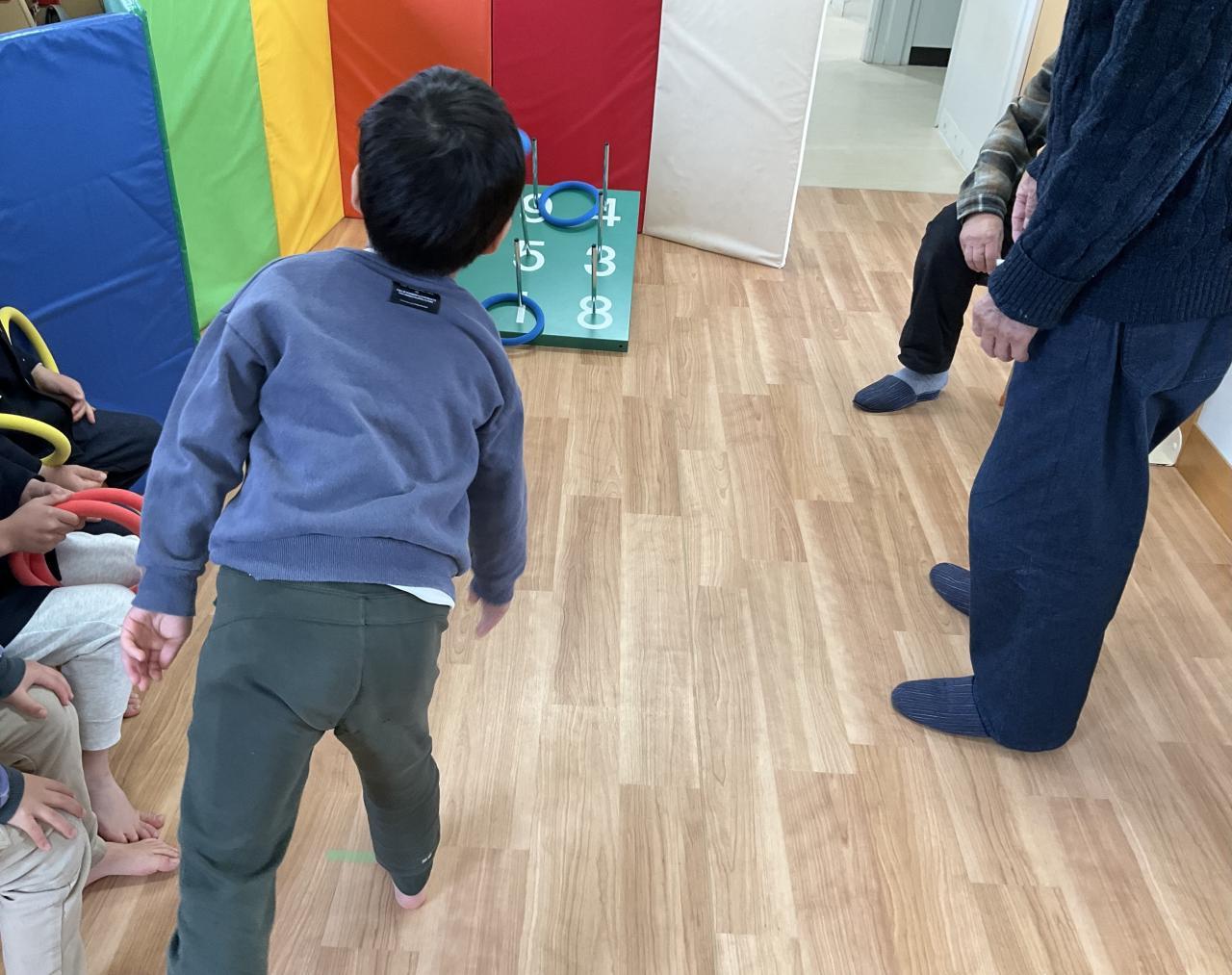 輪投げでは、「上からじゃなくて下から投げたらいいよ」と教えてもらい、入ると「やった!入った!」と大喜び。友達と点数を競って楽しんでいました。