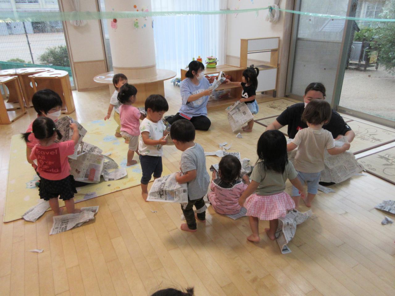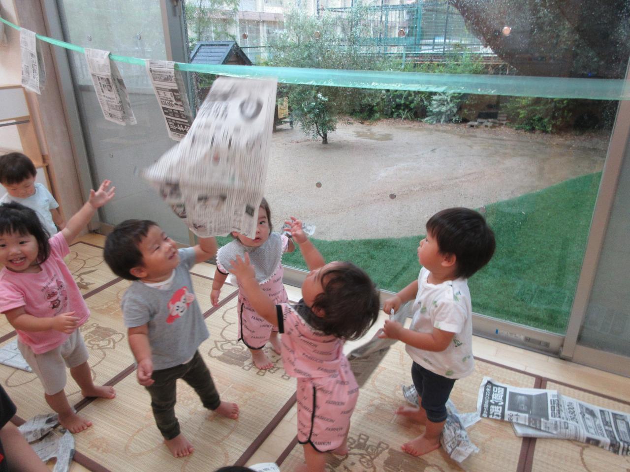 お部屋の中で新聞遊びをすると、「やったー」と大はしゃぎで新聞を手に取り、破いたりかぶってみたりし始めました。上から新聞を洗濯物のようにぶらさげてみると「よいしょよいしょ」と言いながら、ジャンプをして頑張って取ろうとするのですが、短めの新聞紙がなかなか届かず、困った顔になり眉毛がだんだん下がってきました。それでもあきらめず、保育教諭に手伝ってもらいながら取ることが出来ると、大事そうに取れた新聞を握りしめていました。