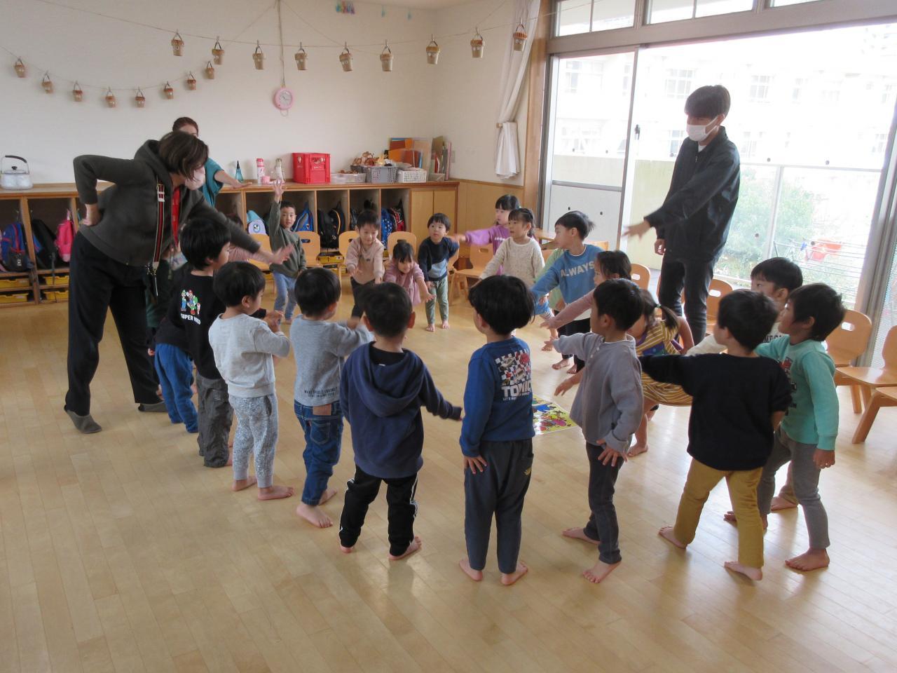英語の先生がお部屋に入ってきた時に「Good Morning」と元気に挨拶していた子どもたち。季節の確認を行い、「November(11月)」「Squirrel(リス)」を教えてもらい大きな声で発音しています。エクササイズでは「Make a circle」の指示にすぐに手を繋ぎ円になり、「Let go」「Hold hand」「Swing」の指示を聞き楽しく体を動かしています。新しく体の部位の単語「hair(髪の毛)」「chin(あご」)」「eyebrows(まゆげ)」「eyes(目)」「ears(耳)」「nose(鼻)」「mouth(口)」を教えてもらった後にゲームをしました。英語の先生が言った部位以外を触り、その部位の単語を発音しました。英語の先生の言ったことにつられてしまう子もいましたが、楽しくゲームに参加しました。最後に絵本「From Head to Toe」を見て絵本に出てきた動物に「Can you do it?」と、この動き出来るかな?と言われると大きな声で「I can do it」とその動きを真似しながら発音し楽しみました。