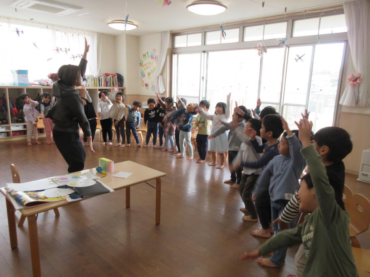 天気の確認をした後、季節に関する英語「November(11月)」「squirrel(リス)」を教えてもらい、英語の先生の真似をしながら元気よく発音することができています。エクササイズでは、「Make a circle.(円を作る)」「Swing.(揺らす)」「Put your hands up.(手を挙げる)」「Put your hands down.(手を下ろす)」「Hold hands.(手を繋ぐ)」「Let go.(手を離す)」などの英語を聞いて、体を動かすことができており、お友だちと触れ合いながら楽しさを共有している子どもたちです。その後は、『Here We Dance Looby-Loo』の英語うたに取り組み、音楽に合わせて体を動かすことを楽しんでいます。『Itchy!』の絵本を読み聞かせしてもらうと、お話の内容をよく覚えてきて、次に出てくる動物や蚊に刺される場所などを積極的に答えることができています。また、動物の気持ちになって「I'm itchy!」と元気いっぱい発音する姿が見られました。最後に英語の先生が発音した体の部位「head(頭)」「shoulders(肩)」「tummy(お腹)」「knees(膝)」「toes(爪先)」を触ったり、英語の先生が指差した体の部位を発音したりして、英語に触れる楽しさを味わっている子どもたちです。