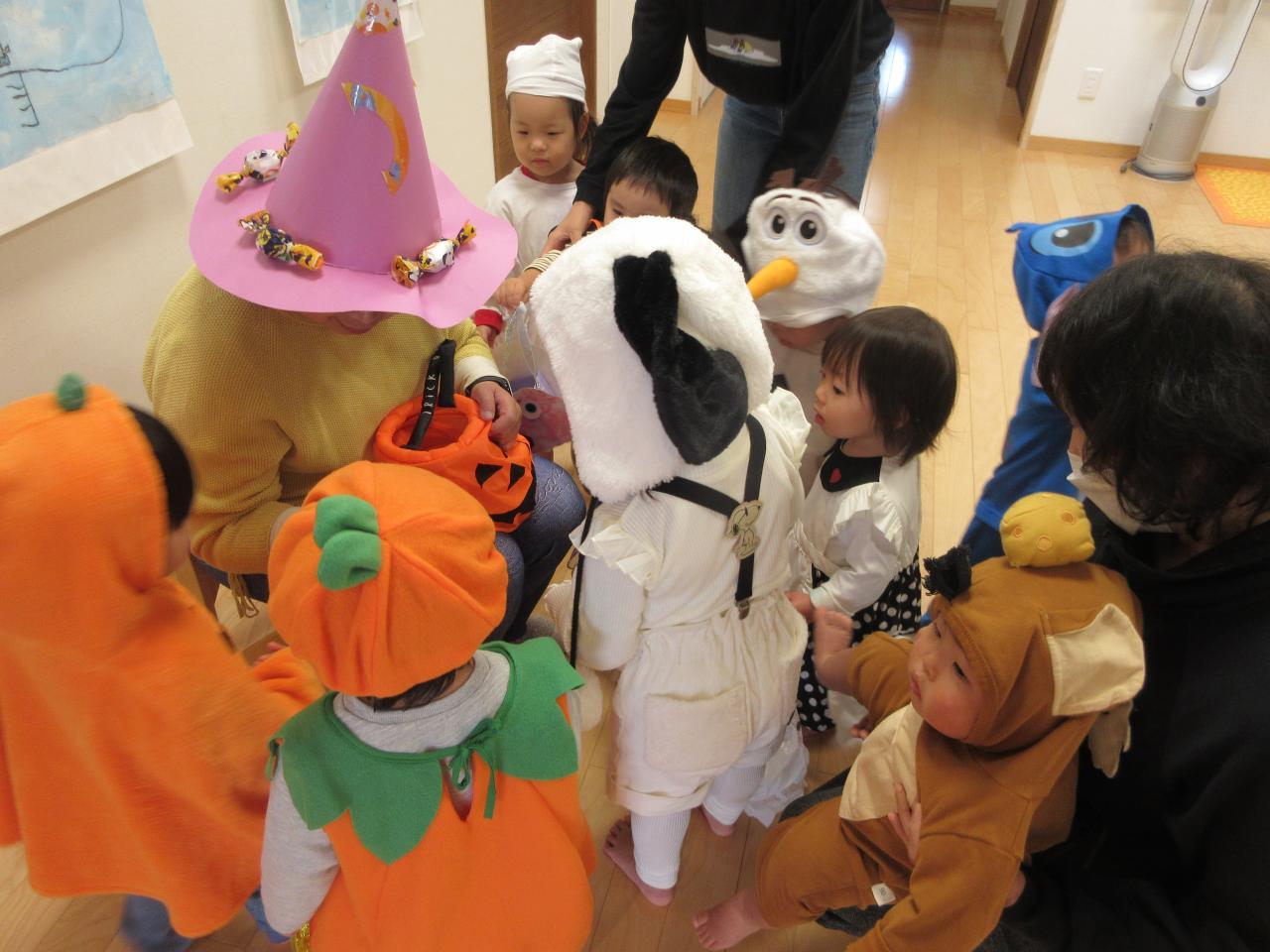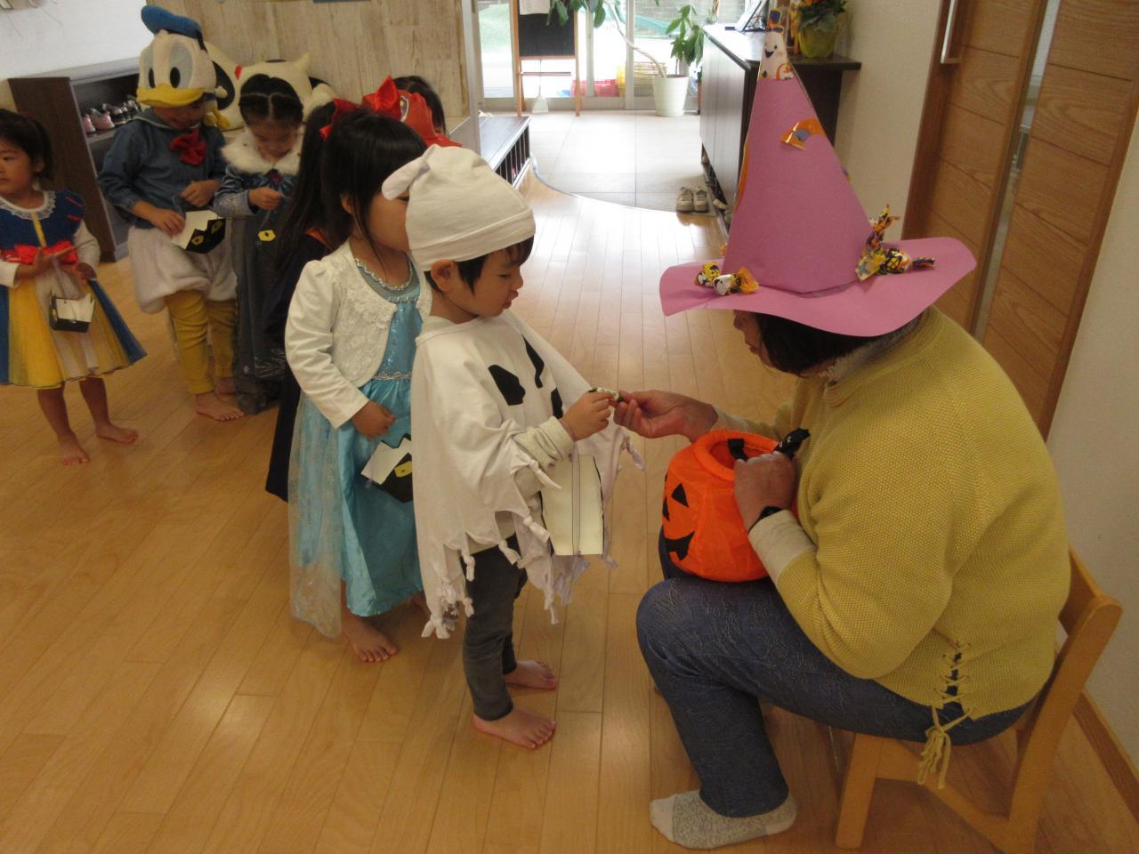 可愛い洋服やかっこいい洋服で仮装してきた子どもたち。お友だちの衣装に興味津々で「これな~に?」「すごいね!」と見せ合っていました。ハロウィン集会では、全クラスが集まり紙芝居を見たりハロウィンのお話を聞いたりしました。クイズではハロウィンに因んだクイズを6問しました。答えが分かったときは「はい」と手を挙げて答えています。又、ミステリーボックスのゲームもしました。黒い箱の中に入っているものを当てるゲームです。ミステリーボックスに手を入れて探り、ドングリやりんご、バナナ、さつまいもを当てていきました。それから楽しみにしていたお菓子をもらいに行きました。自分で作ったカバンにもらったお菓子を入れて、各クラスに帰っていただきました。