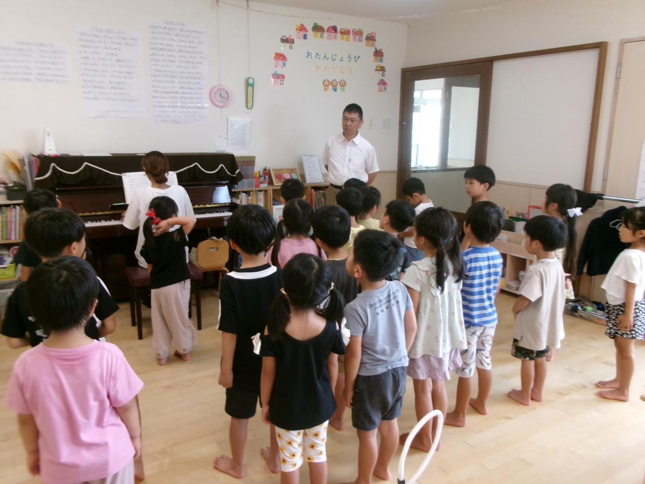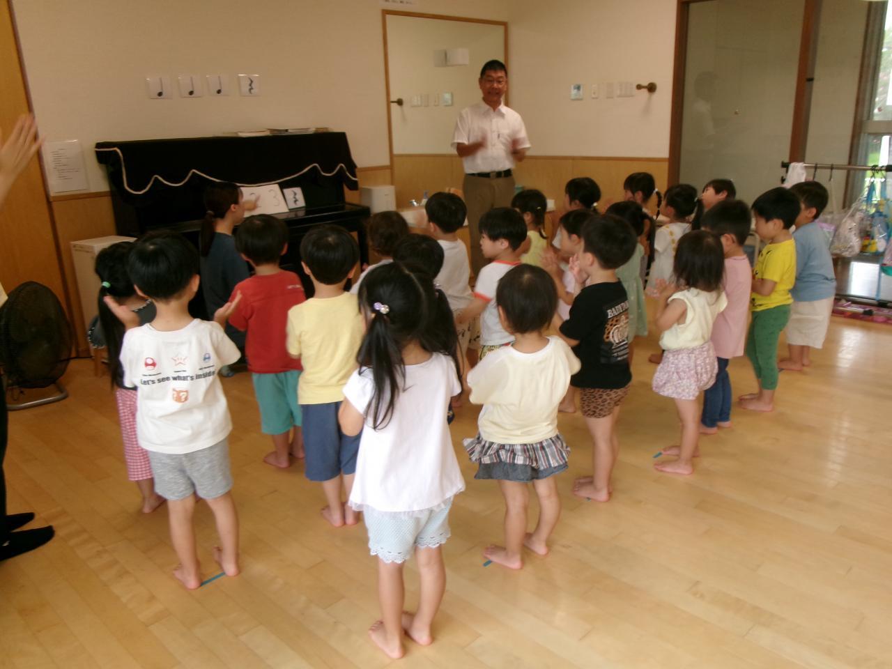 内田先生に挨拶をし、8月の歌『スイカ』『トマト』『アイアイ』を歌いました。『トマト』は、最初の高い音をきれいに発声できるよう、口を手でおおい自分の声とピアノ両方がしっかり聞こえる状態で歌う練習をしました。『アイアイ』は、口を大きく開けて、「あ」と「い」の口を意識して歌いました。リズム打ちでは、テンポを変えて3拍と7拍のリズム打ちに取り組み、内田先生や保育教諭の手拍子に合わせて手を叩くことができています。