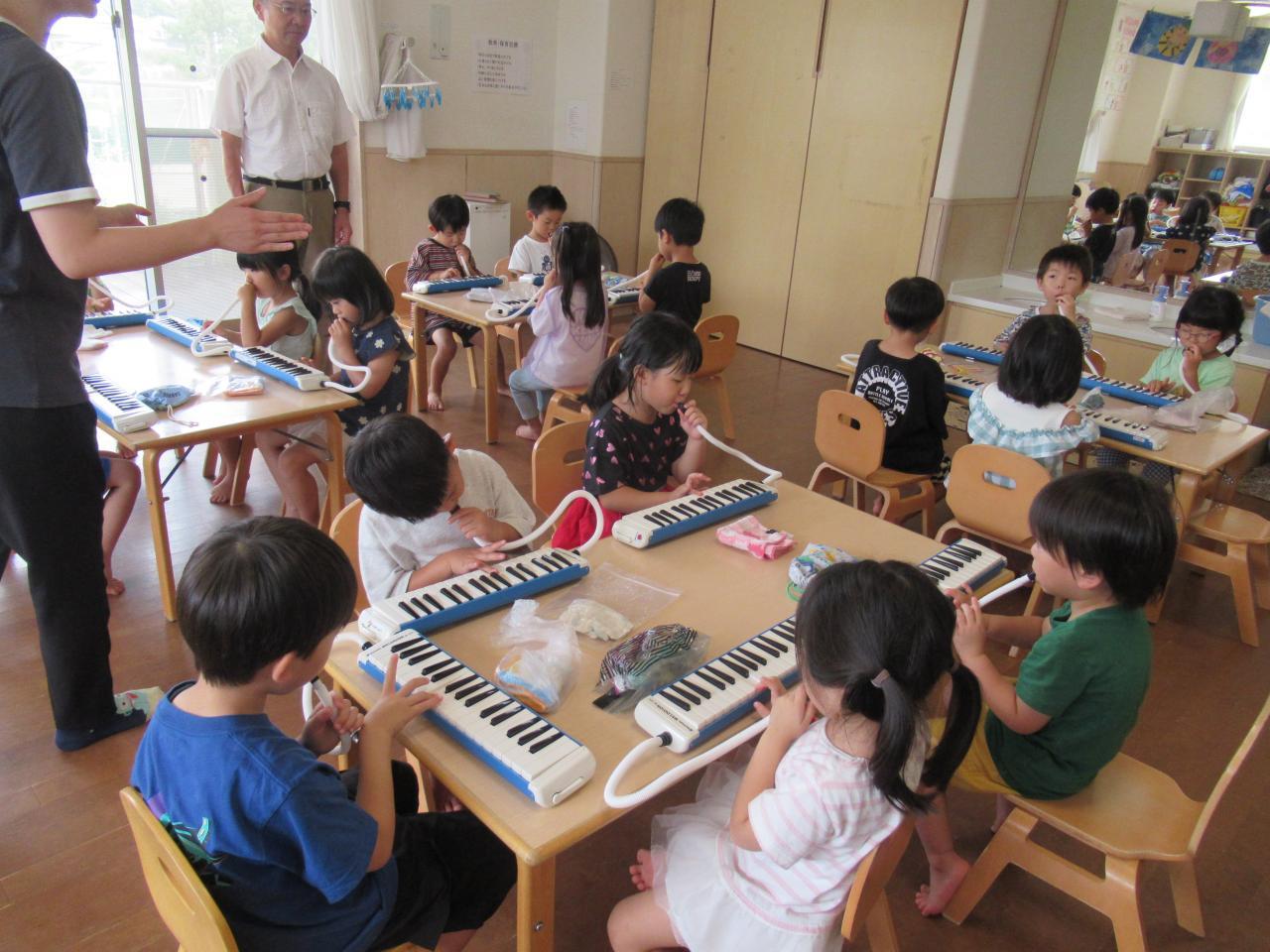 発声練習では、優しい声でピアノの音に合わせながら取り組むことができています。低い音は、手をふわっと横に下ろして体の力を抜くと出しやすいことを教えてもらい、意識をすることできれいに出すことが出来ました。8月の歌『みなみのしまのハメハメハだいおう』『おへそ』『てをつなごう』では、一息で言葉を繋げながら歌うことを教えてもらいました。鍵盤ハーモニカは、ロングトーンやタンギング、レガートタンギング、ドレミファソファミレドの指くぐりに取り組み、『チューリップ』の部分奏、『カエルの合唱』『メリーさんのひつじ』を演奏しました。スイカの種を一粒飛ばすイメージで息を吹くことや「トマト」のリズムで鳴らすことを教えてもらい、練習をすることで上手に鳴らせるようになりました。