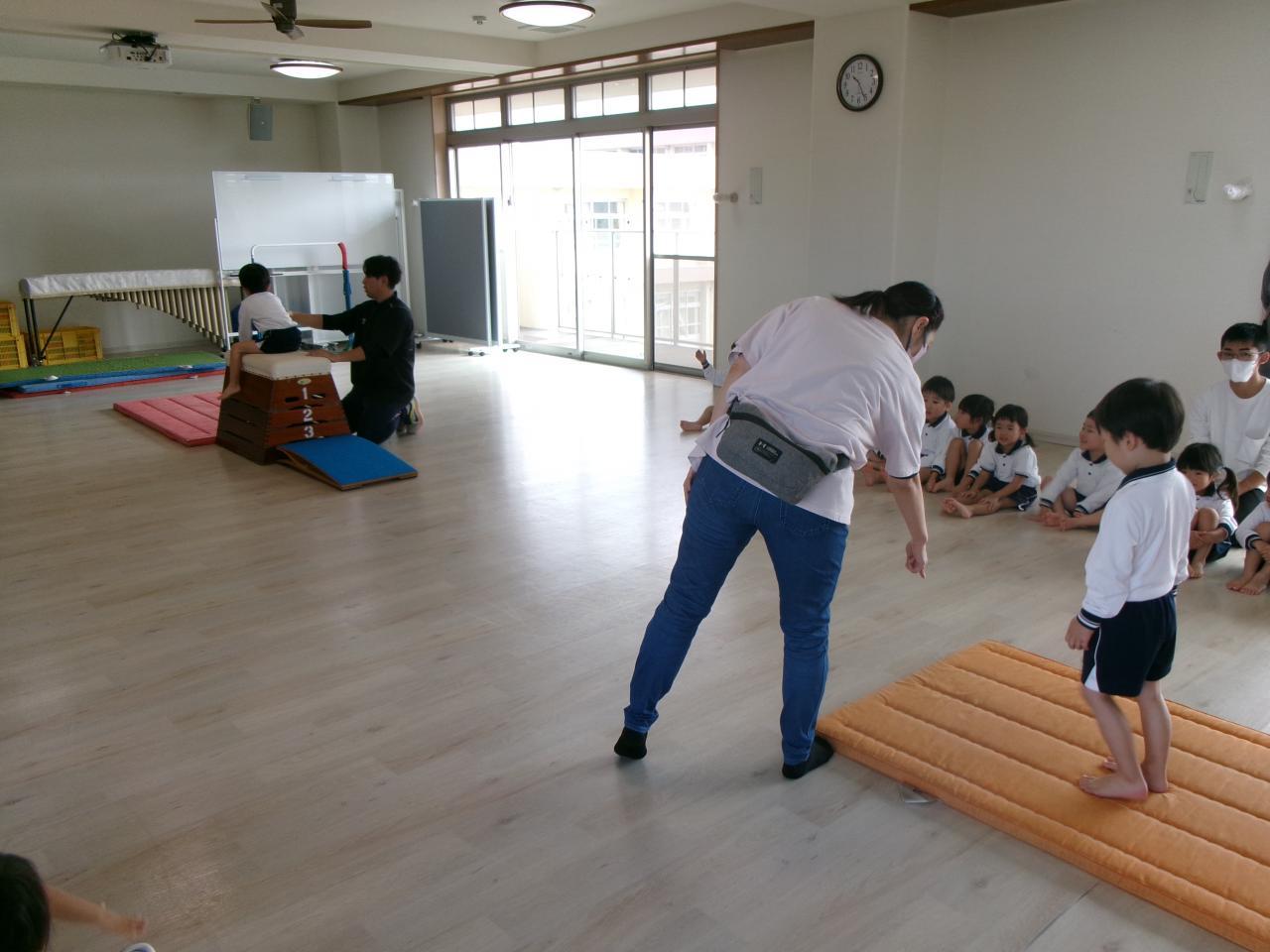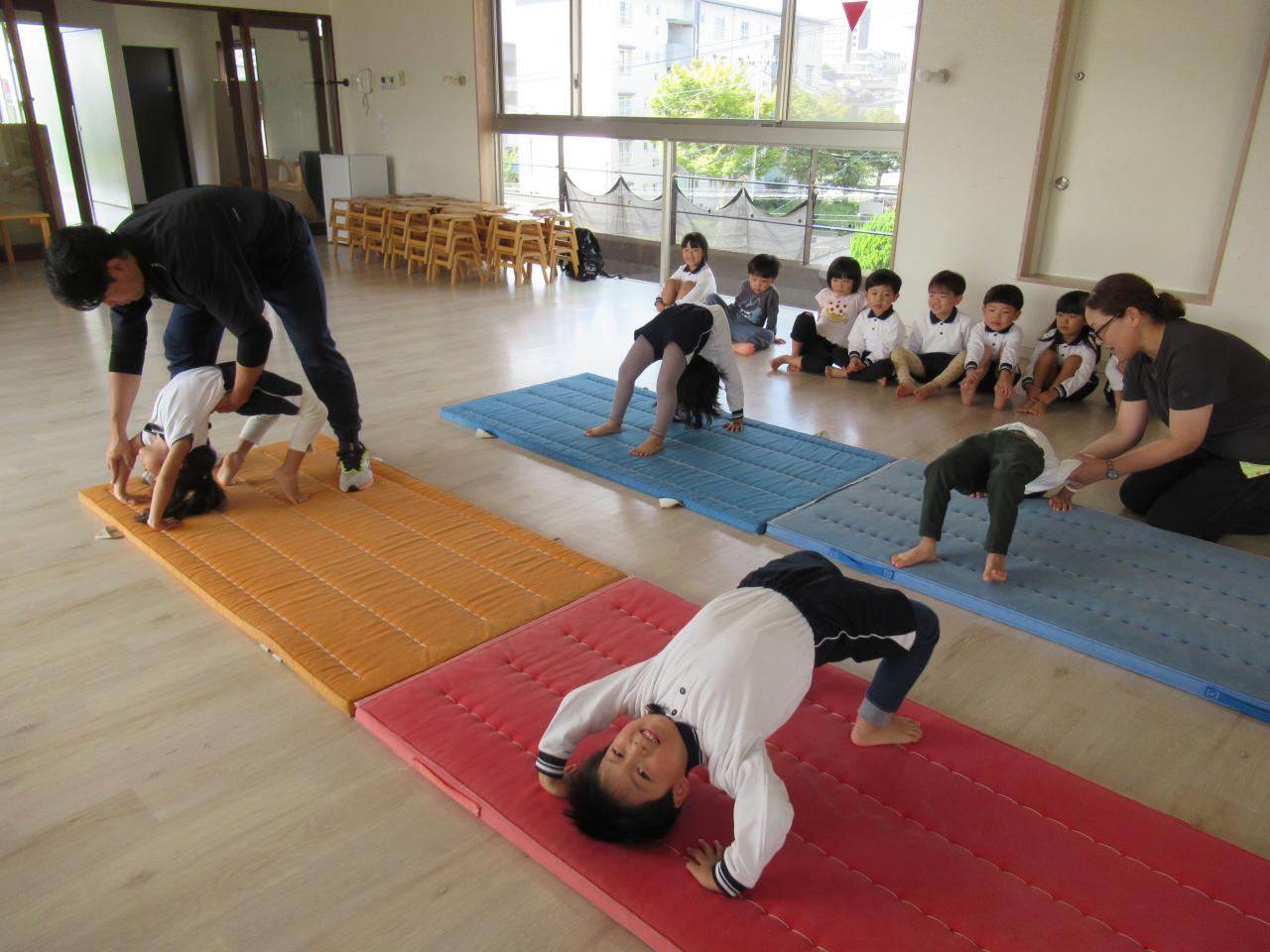 準備体操を行った後、マット運動を行いました。グーパージャンプ、サイドステップをそれぞれ行い、後ろスキップや背倒立に挑戦しました。マットに寝転がり、腰に手を当て体を支えながら両足を上にピンと伸ばすことを教えてもらい、背倒立を行いました。初めはどうするのか難しく足が上がらない子もいましたが、石元先生に丁寧に教えてもらい手の位置や背倒立の仕方を理解し挑戦しています。また跳び箱や大縄に取り組み、跳び箱ではロイター板をグーで踏みパーでジャンプすることをその都度教えてもらい、大繩では入るタイミングやジャンプするタイミングを丁寧に教えてもらい楽しみながら取り組んでいる子どもたちです。