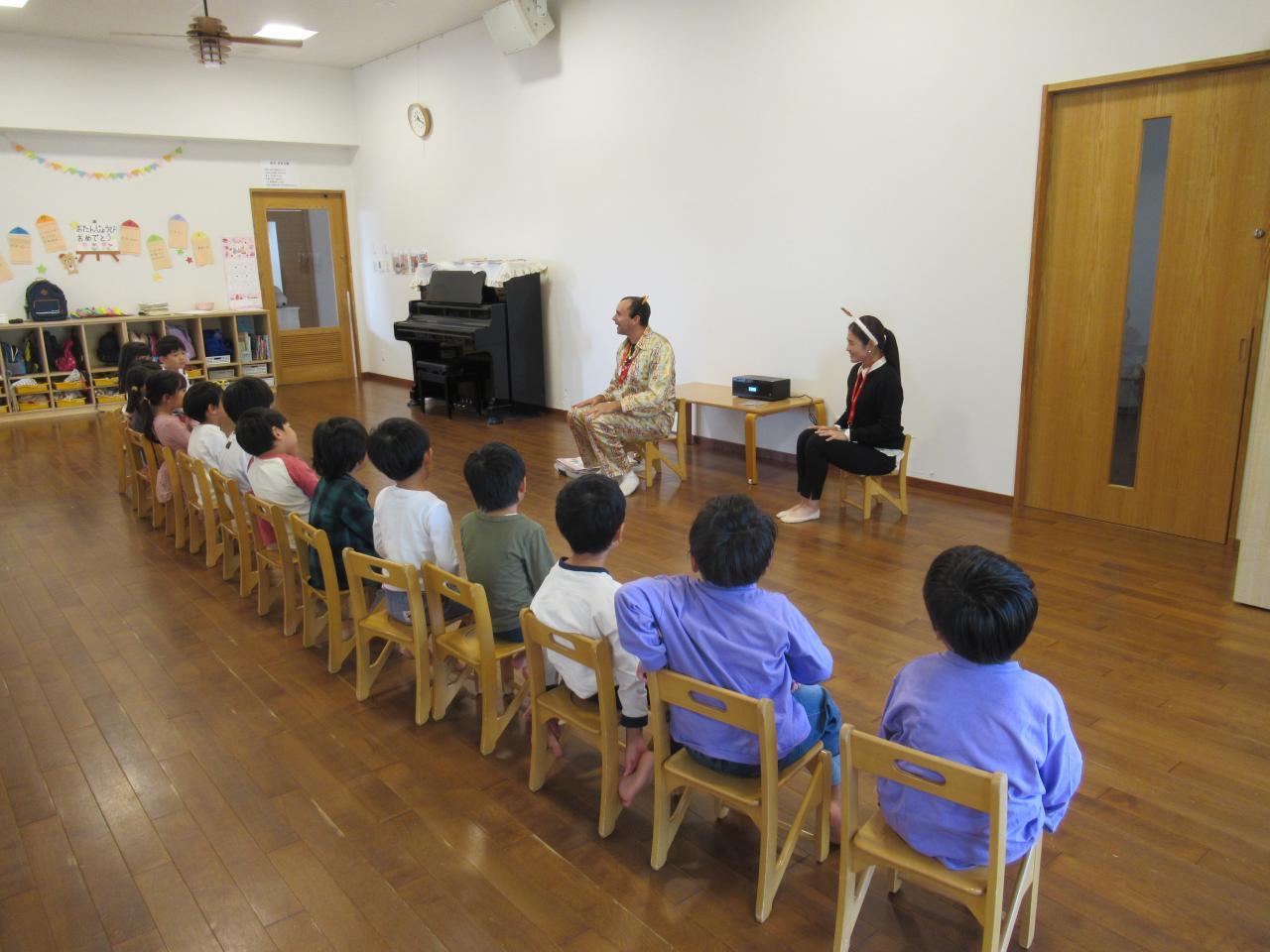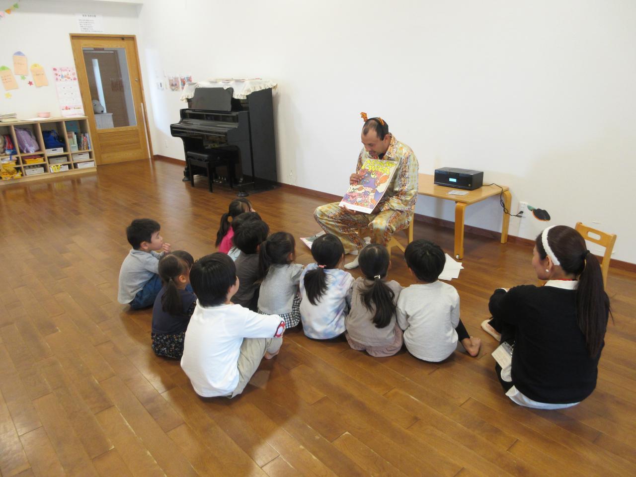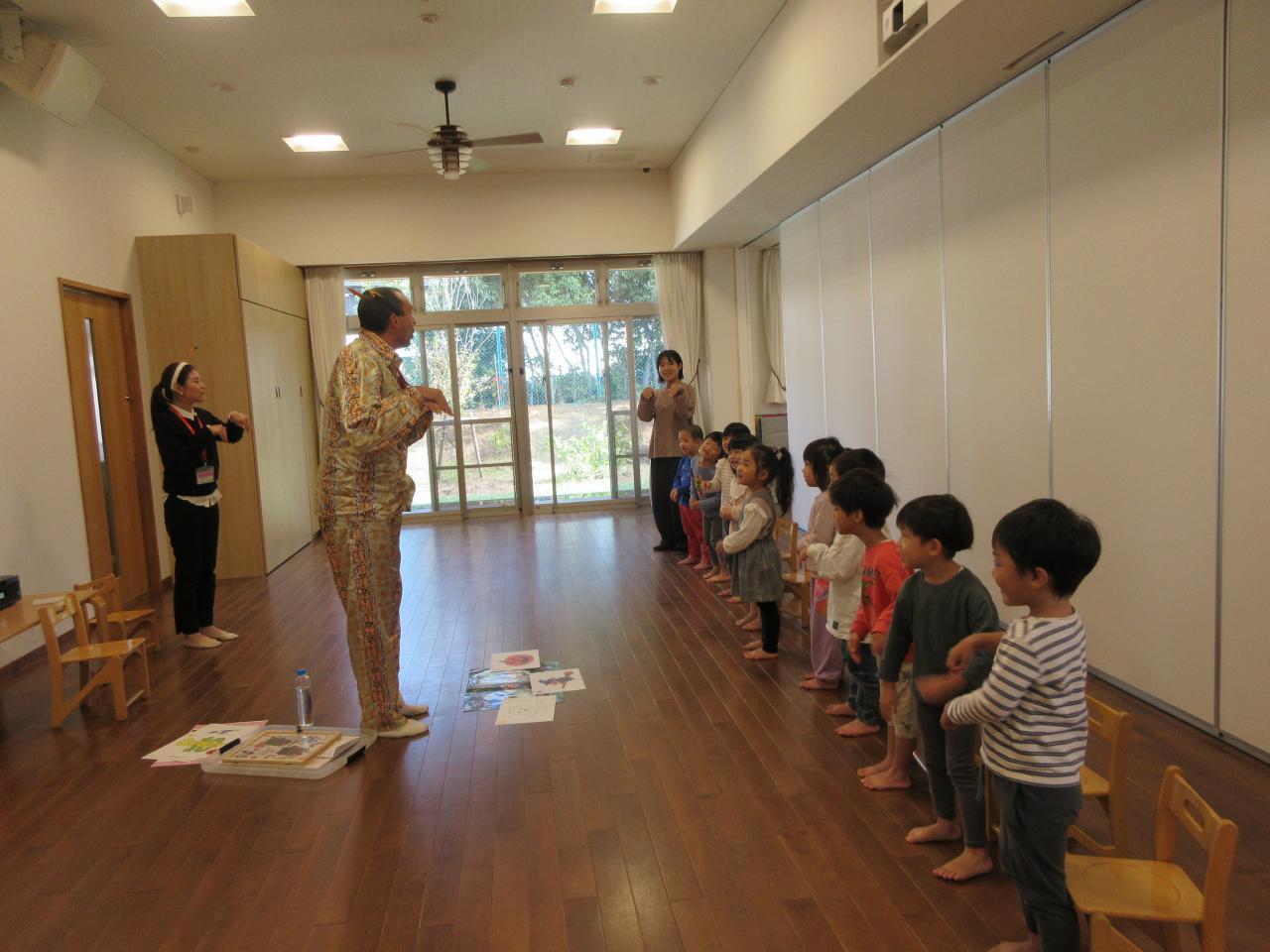 ネイティブの先生が来てくれ、最初にご挨拶をして名前を言いました。ハロウィンについて教えてもらい、オバケや魔女、コウモリなどになって発音したり、それぞれの絵カードを使って当てるゲームをして楽しんでいます。また魔女のお話の絵本では、一緒に英語を言いながら見ました。最後にハロウィンのシールをもらい、「センキュー!」とニコニコの子どもたちです。