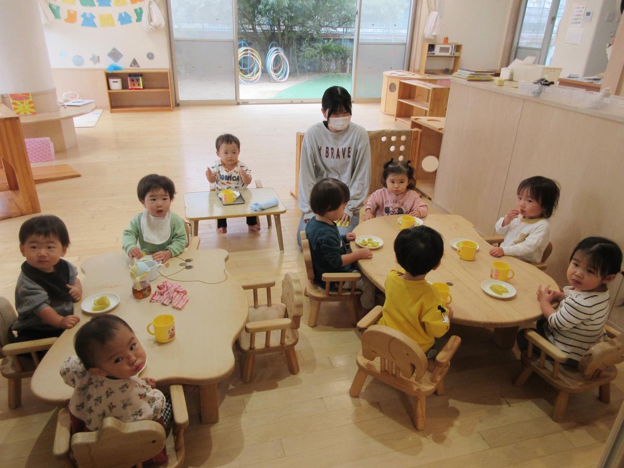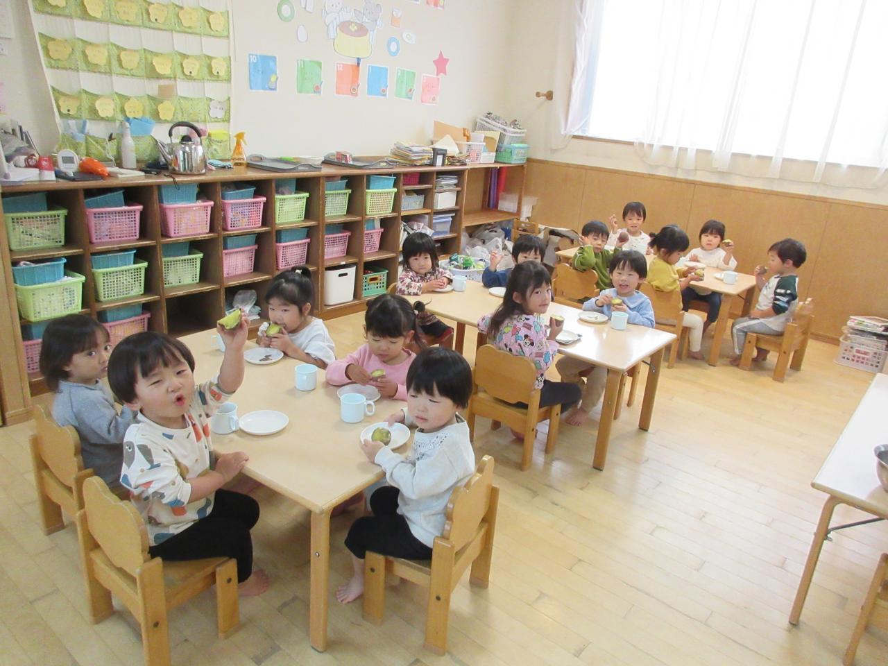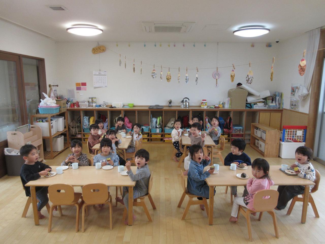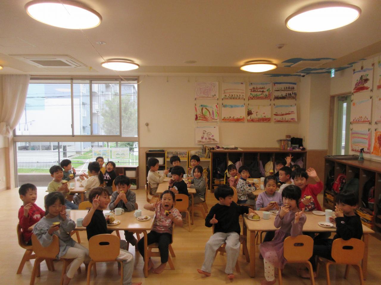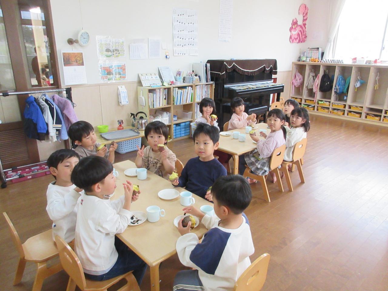 出来上がったお芋を見ると、「おっきい!」「いいにお~い」「おいしい~」などと喜びながら、みんなで一緒に食べました。