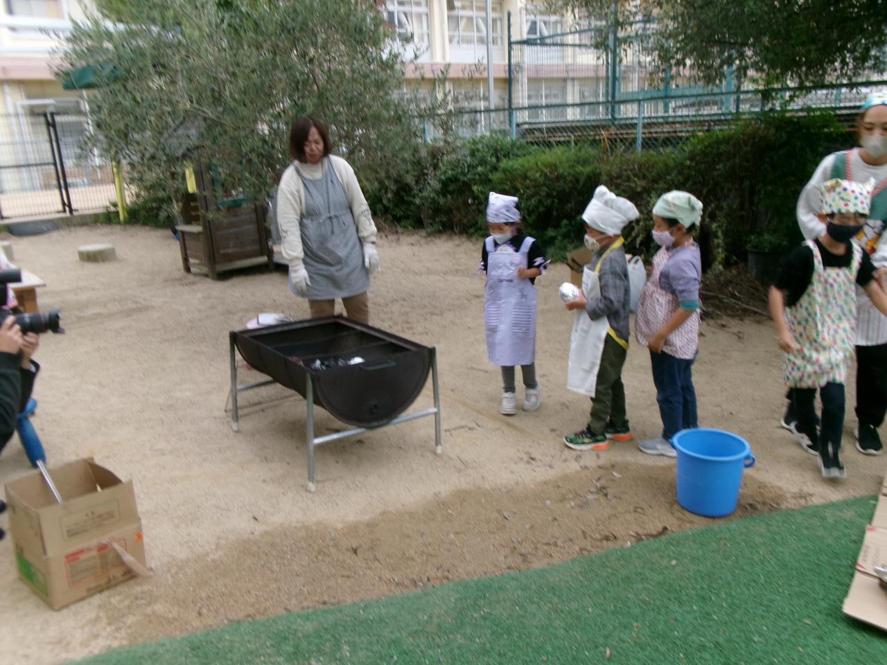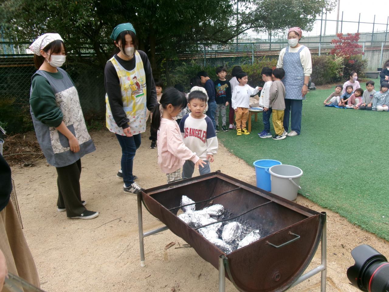 お芋が焼ける匂いがしてくると、「いいにおい!」「たべた~い」と楽しみにしている子どもたちです。