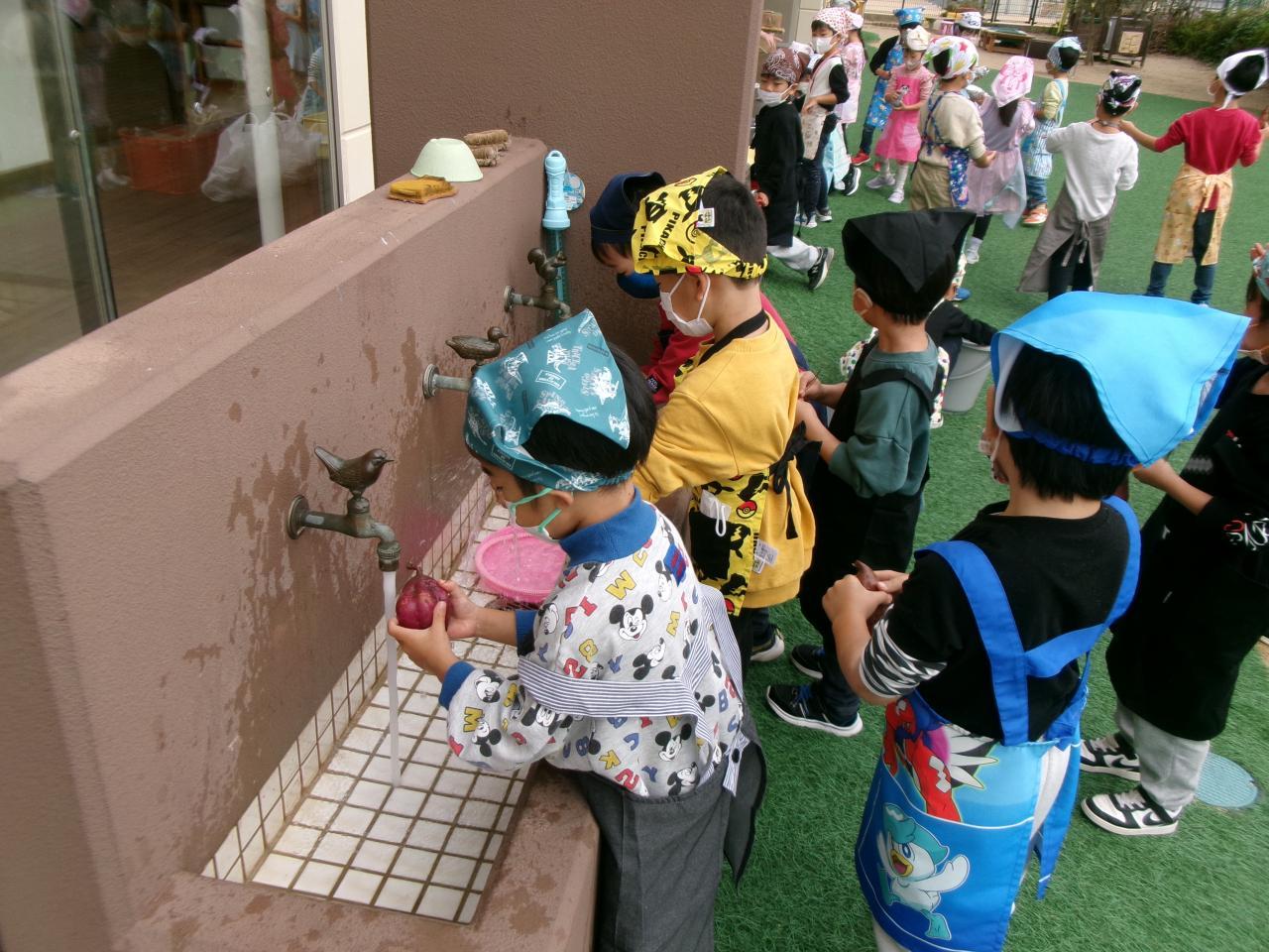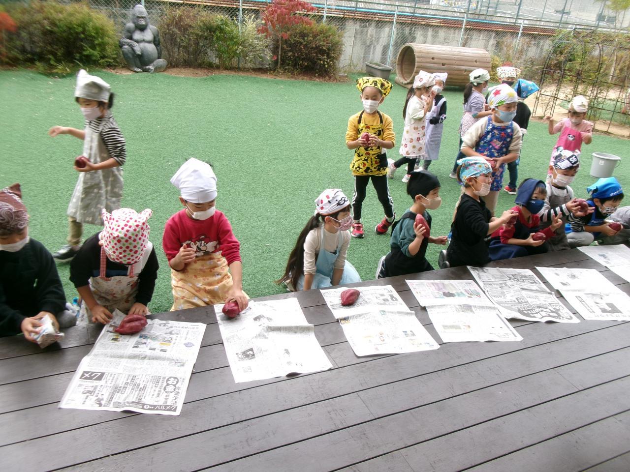 朝から「やきいもたのしみ!」「はやくたべた~い」とワクワクしている子どもたち。らいおん組の子どもたちは朝からさつまいもを洗い、新聞紙やアルミホイルに包みました。