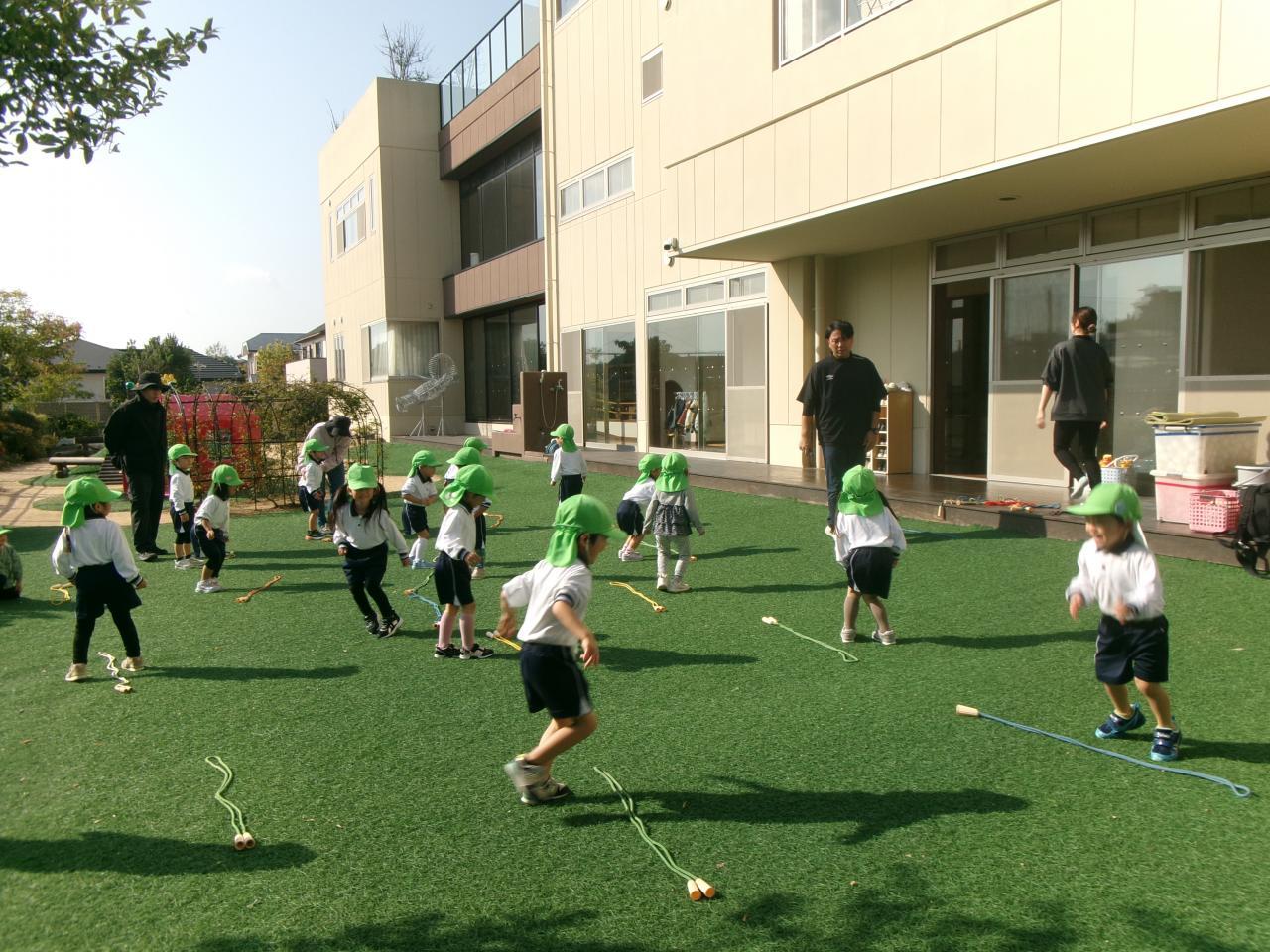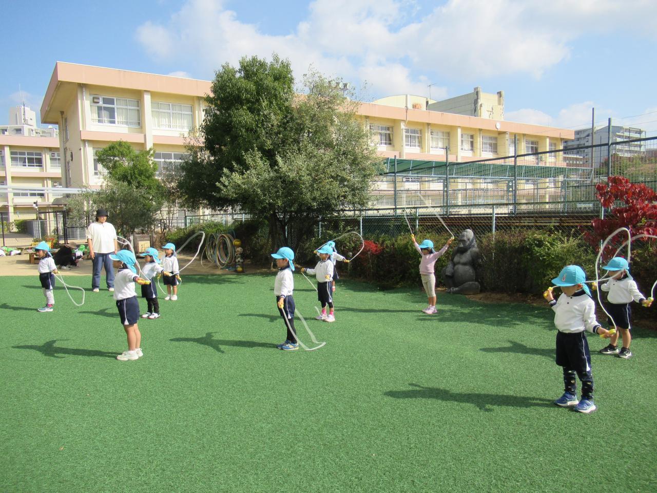 今日は園庭で縄跳びをしました。縄跳びをする時の約束事を教えてもらい、嬉しそうに縄を持って園庭に広がる子どもたちです。縄跳びを芝生に置き線をつくると、線を踏まないようにジャンプをしました。跳ぶ時に足が開かないようにグージャンプを意識しながら、前後や左右のジャンプも楽しんで取り組んでいます。ジャンプをしたあとは縄をもって横に揺らしたり、前後に縄を回すことに挑戦しました。はじめは足に引っかかり、「できない~」と言っていた子どもたちも、何度かするうちにスムーズに行えるようになり、「みて!できた!」「もういっかいする!」と意欲的に取り組む姿が見られます。