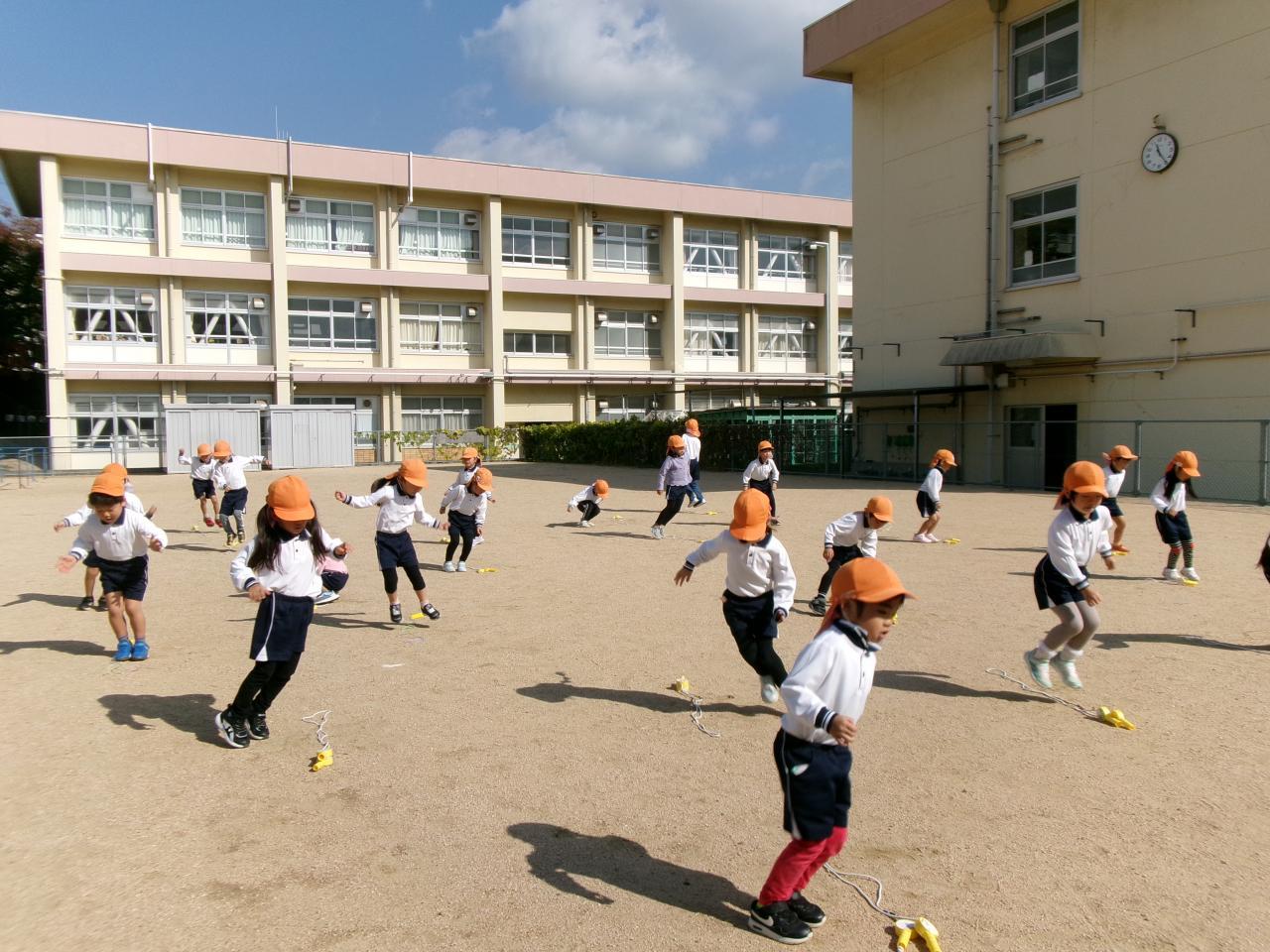 元気よく準備運動を行った後、縄跳びに挑戦しました。最初は、縄を下に置いて両足跳びや片足跳びを行い、ジャンプの仕方を確認しました。縄を踏まないように足元を見ながらしっかりとジャンプをすることが出来ています。また、体を真っ直ぐにして手首を使いながら縄を回すことを教えてもらい、様々な場所で縄を回す練習をしました。技が出来るようになるとシールがもらえることを知り、何度も挑戦しながら一生懸命に取り組む子どもたちです。一回跳びと連続跳びの違いも教えてもらい、どうやったら跳べるのかを友だちと見せ合って考えながら取り組みました。少しずつシールが増え、嬉しそうな子どもたちです。