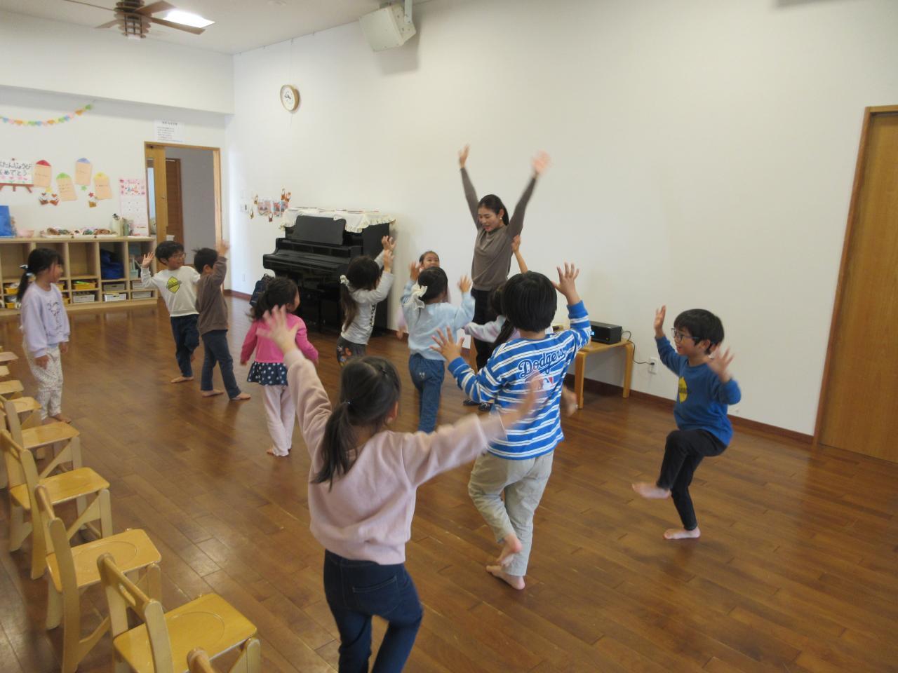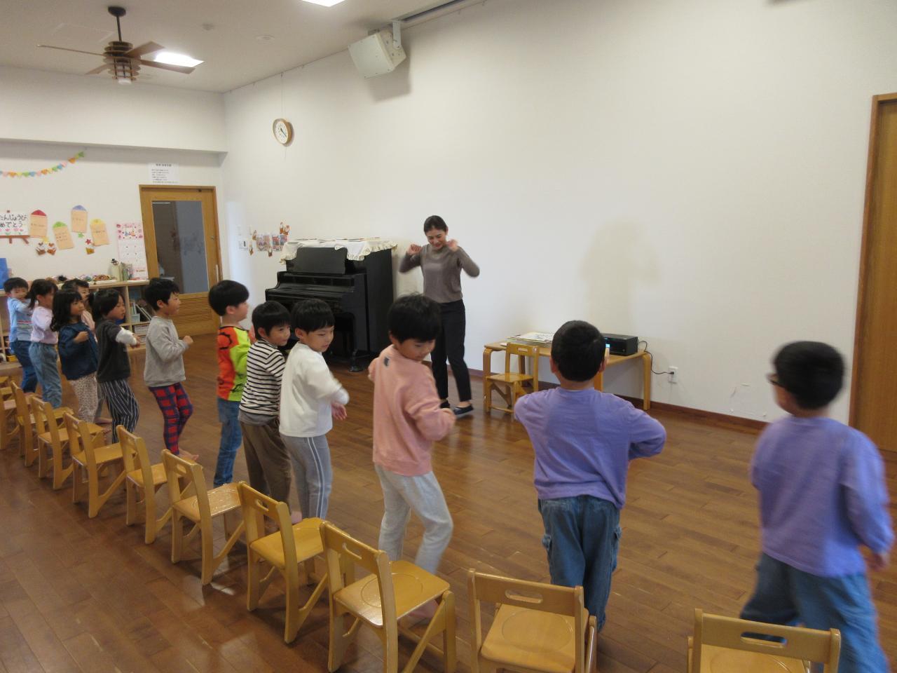 季節の単語「November(11月)」「maple leaf(紅葉)」「squirrel(リス)」を教えてもらいました。大きな声で発音できています。また、ストレッチやボディーじゃんけん、カップゲームをしました。ボディーじゃんけんは、口や鼻、目、髪の毛などを触ってジェスチャーしながら発音し、先生のジェスチャーと違う場所を触るゲームです。カップゲームは、二人組になり、口、鼻、目などの言われた場所のジェスチャーをして、「カップ」と言われたら下に置いてあるカップを早く触った方が勝ちのゲームです。よく聞いて動くことが出来ました。たくさんゲームをして楽しく英語に参加する子どもたちです。