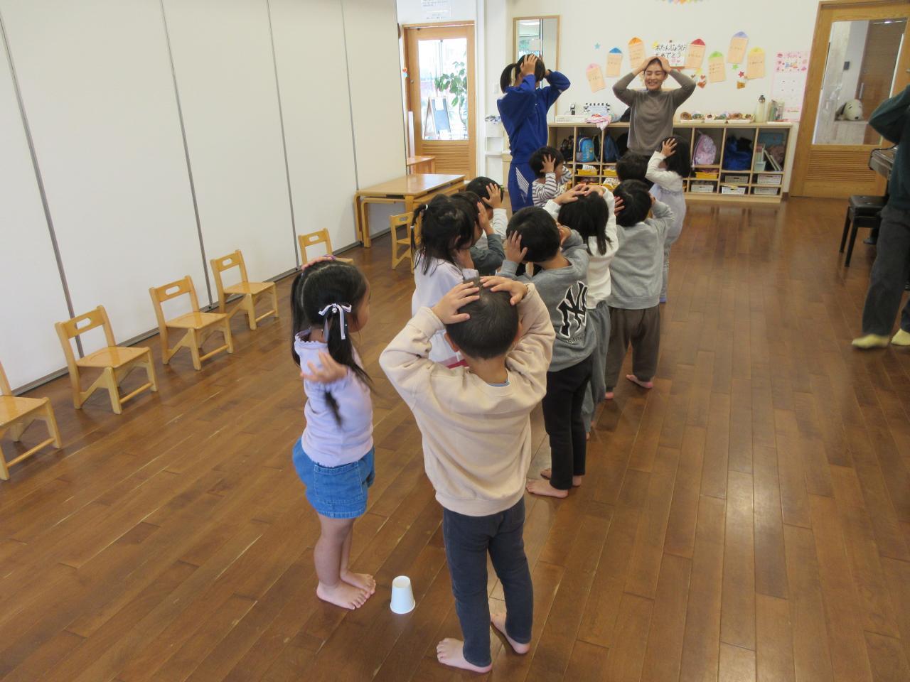季節の単語で「November(11月)」「maple leaf(紅葉)」「squirrel(リス)」を教えてもらい発音しました。手や口、膝など言われた場所を触り、「カップ」と言われたら下に置いてある紙コップを触る、カップゲームをしました。「先に触れた!」と話しながら参加しています。また、ボディージャンケンをしました。頭や足など先生と違う場所を触ると勝ちのゲームで、「あいこ!」「勝った!」などルールを理解して楽しんでいる子どもたちです。